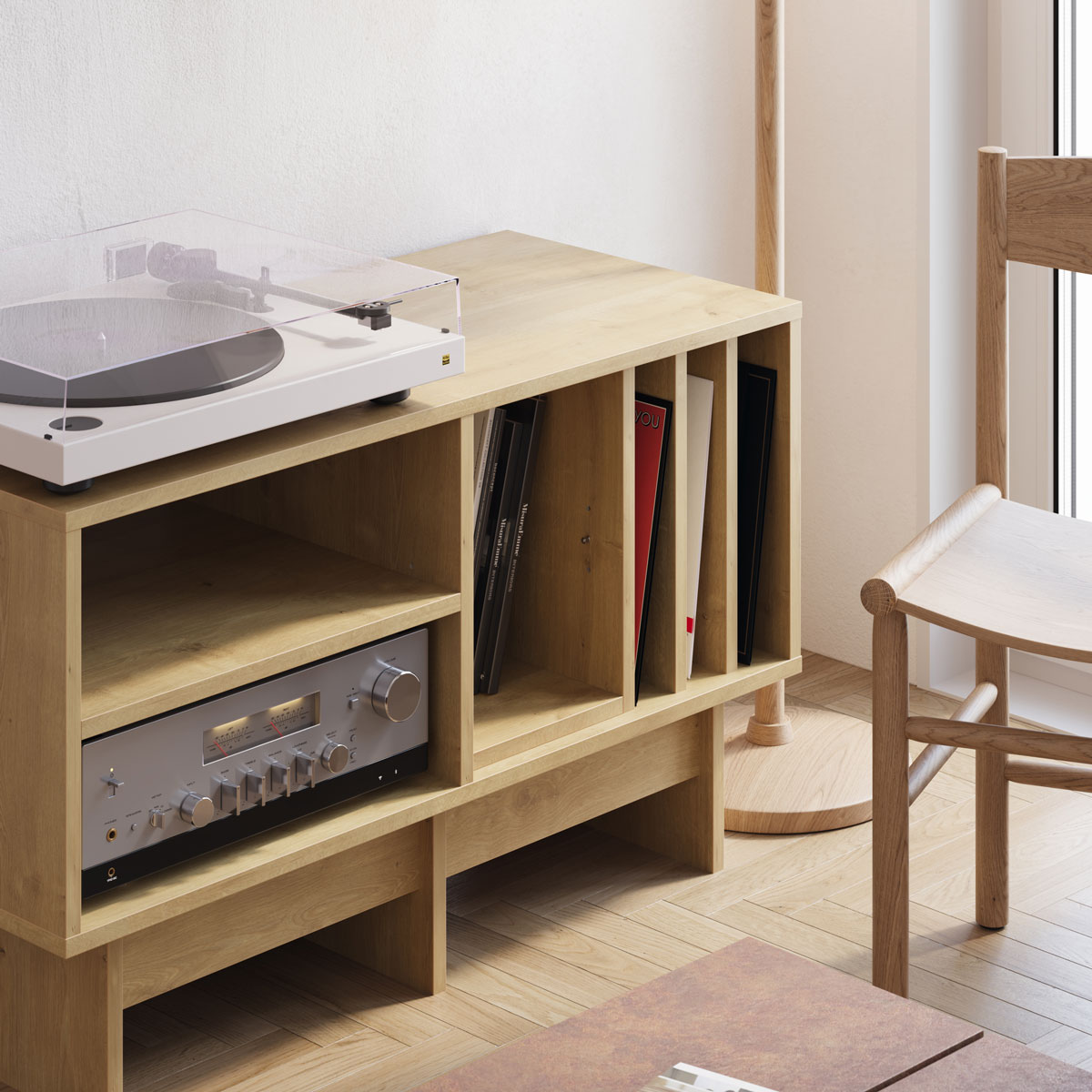 Her får du tre dedikerte rom for vinylplater, supplert med to åpne seksjoner med hylle for bøker, pynt eller personlige detaljer. Den stabile basen med gjennomtenkte forsterkninger gir et løftet uttrykk som gjør rengjøring enklere.