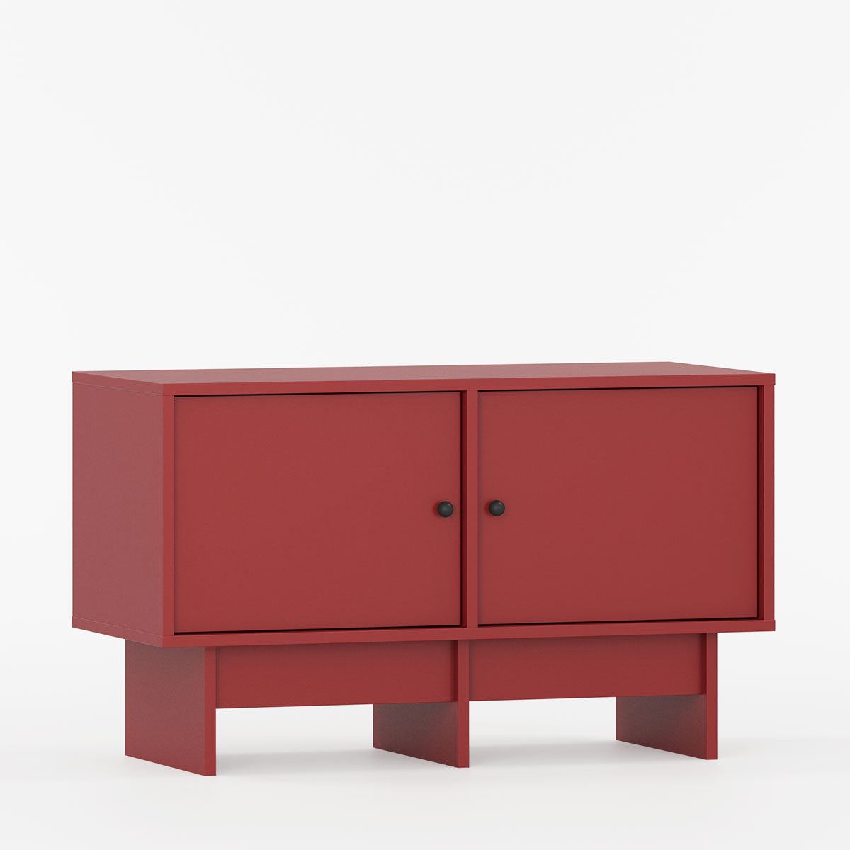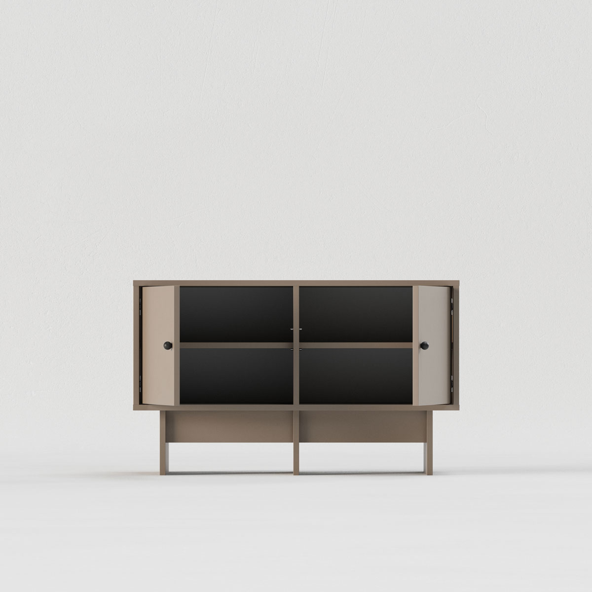 Den karakteristiske basen er forsterket med loddrett skillevegg og tverrgående lister som gir møbelet et eksotisk preg. De tilbaketrukne frontene skaper dybde og ro. Dimensjoner, farger og håndtak kan tilpasses dine ønsker.