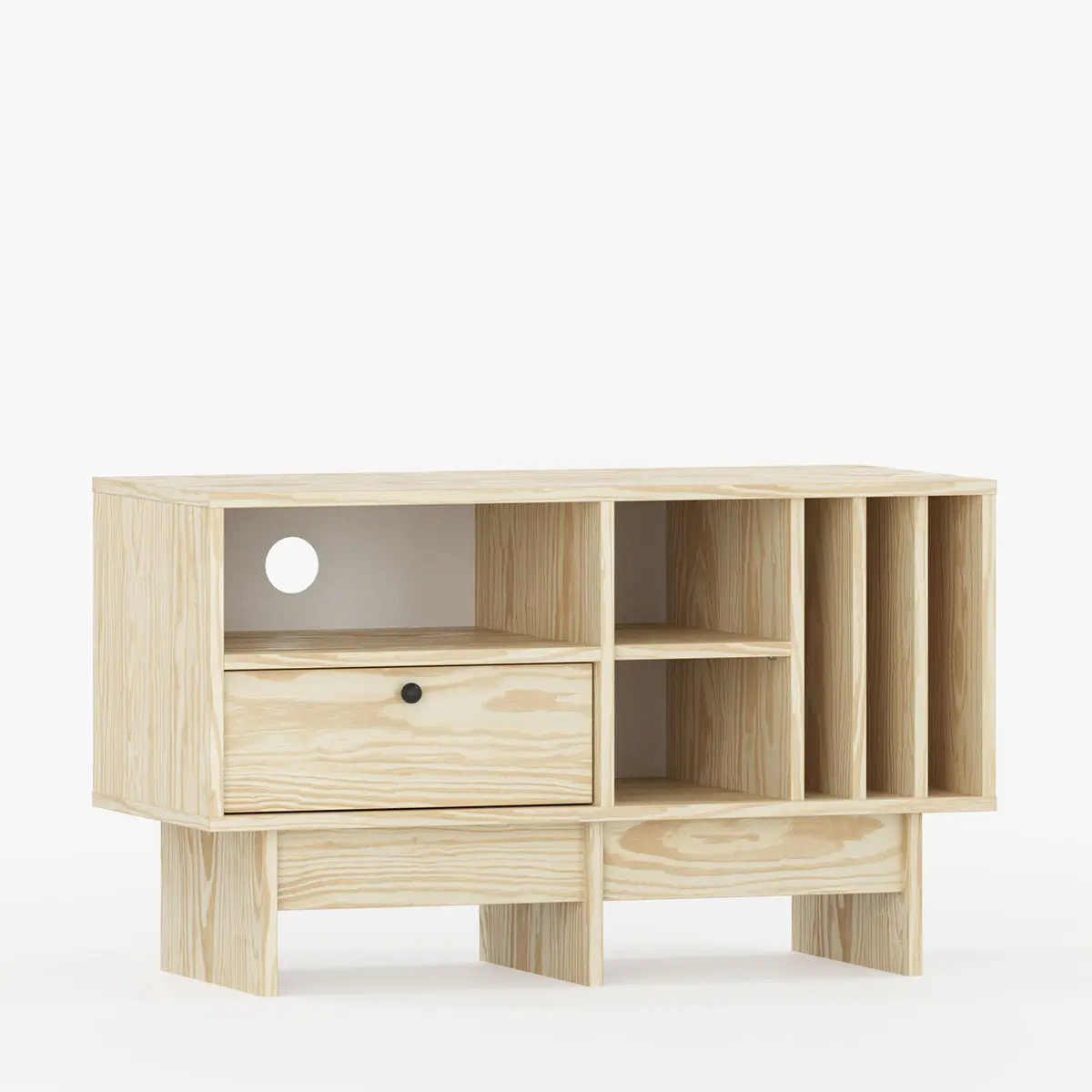 Her får du tre dedikerte rom til vinylplater, supplert med en hylle og en romslig skuff under – perfekt for tilbehør, fjernkontroller eller småting. Den karakteristiske basen gir møbelet et løftet preg og gjør rengjøring enklere.