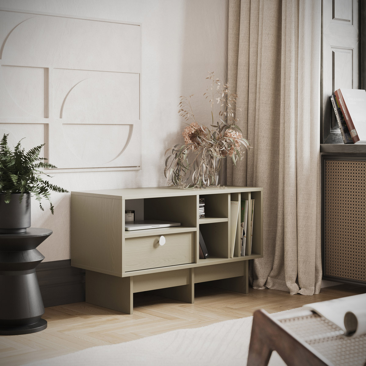 TV-bord KABE KTV1SW – Japandi-kompakt for vinyl og skuffer