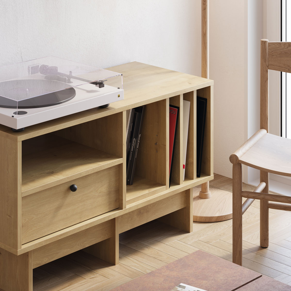 Med et balansert uttrykk og praktisk oppbevaringsløsning er denne modellen ideell for vinylentusiaster som ønsker både funksjon og stil. Den passer godt i mindre rom der plassen skal utnyttes smart, enten det er på hjemmekontoret, i stuen, på soverommet eller i spisestuen.