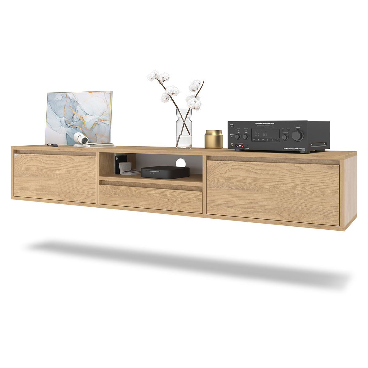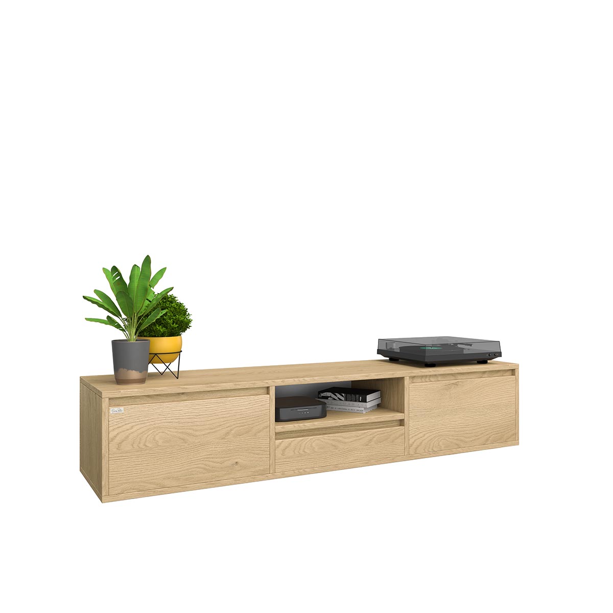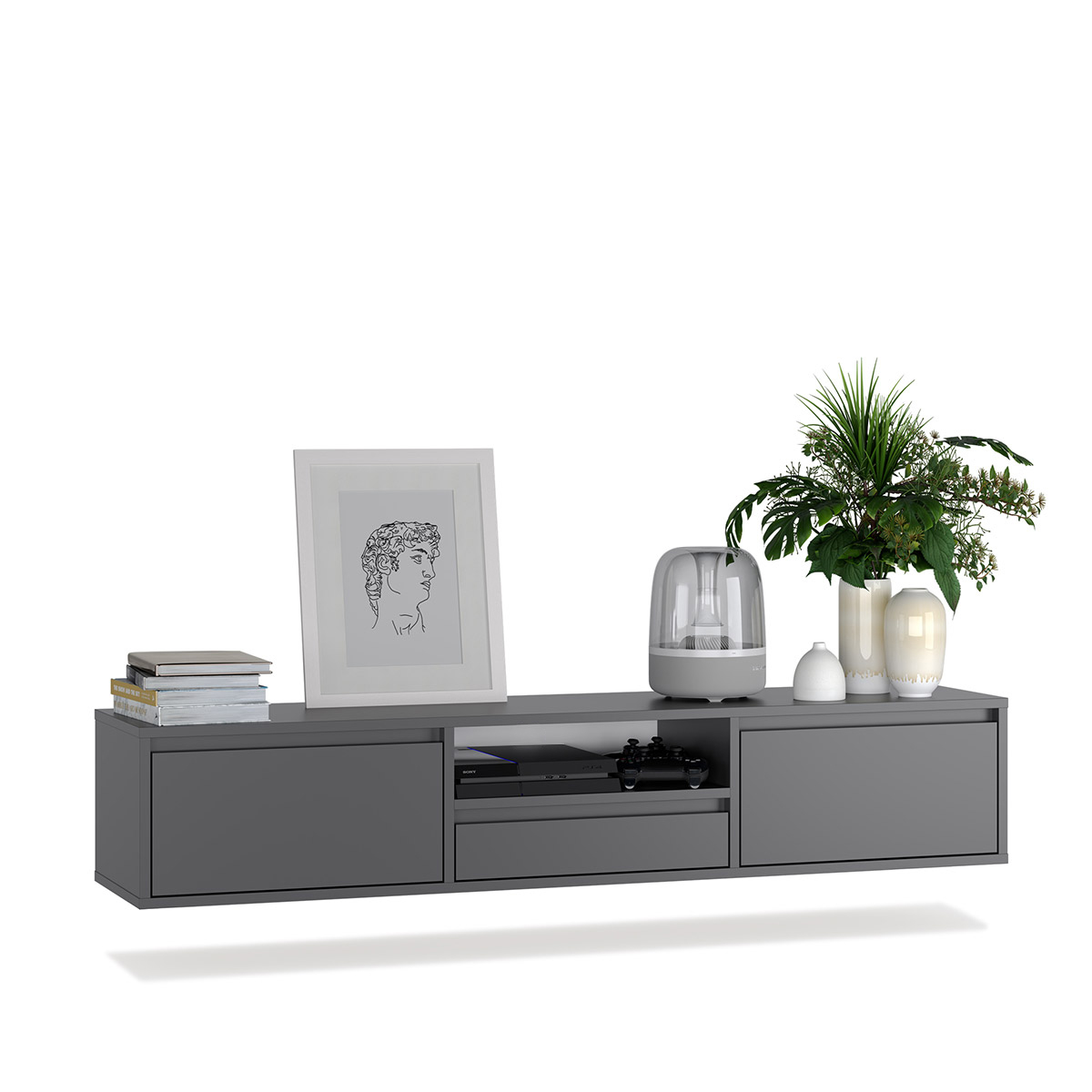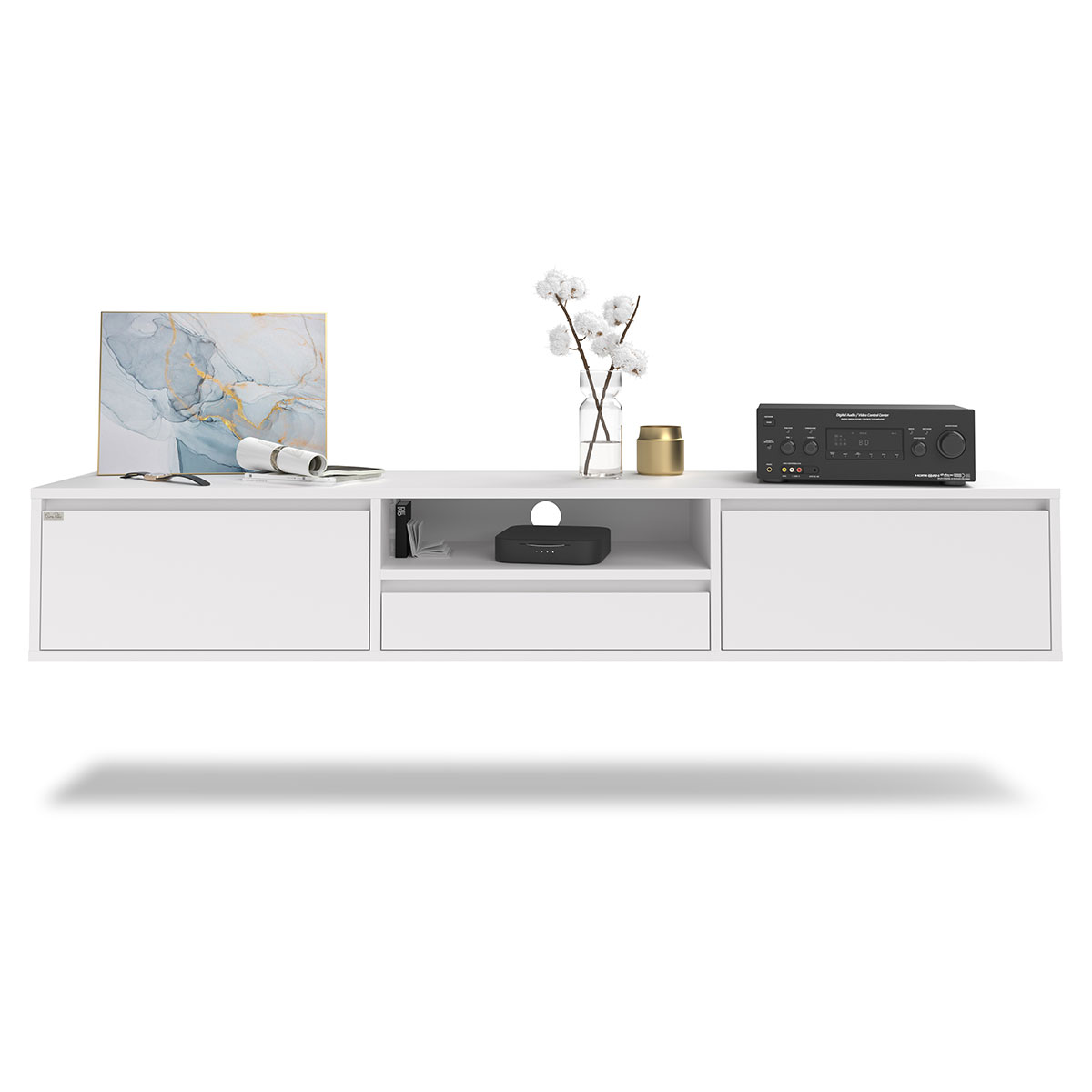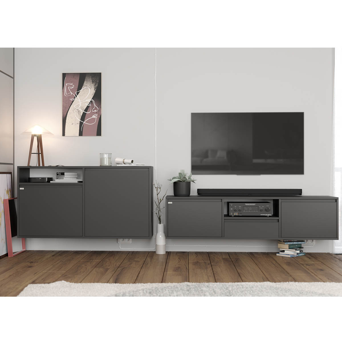 Elegant vegghengt TV-bord med to dører og en åpen hylle.