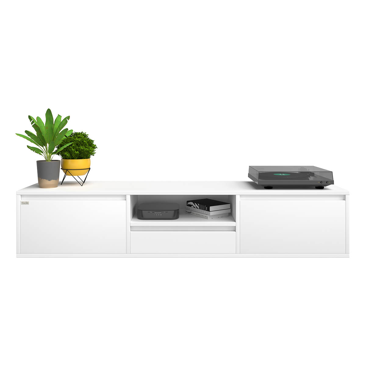 UBBE WTV4 skaper letthet i rommet med sitt svevende design uten ben. Fire grepfrie oppbevaringsrom med gassdempere og en praktisk skuff i midtseksjonen gir diskret og organisert oppbevaring til alt du trenger.