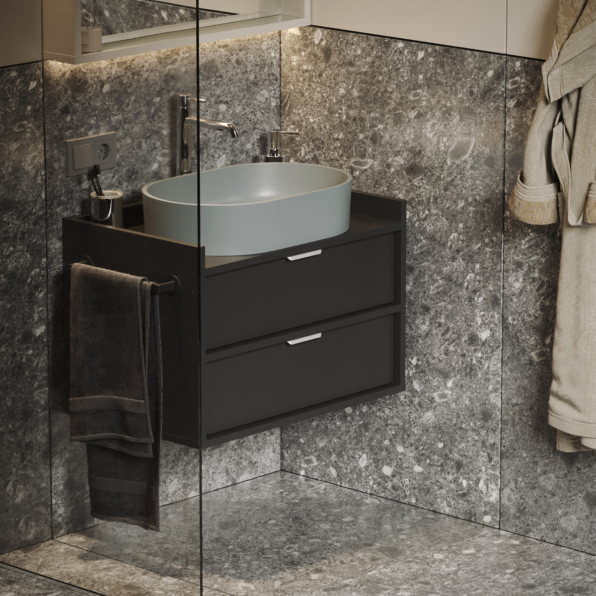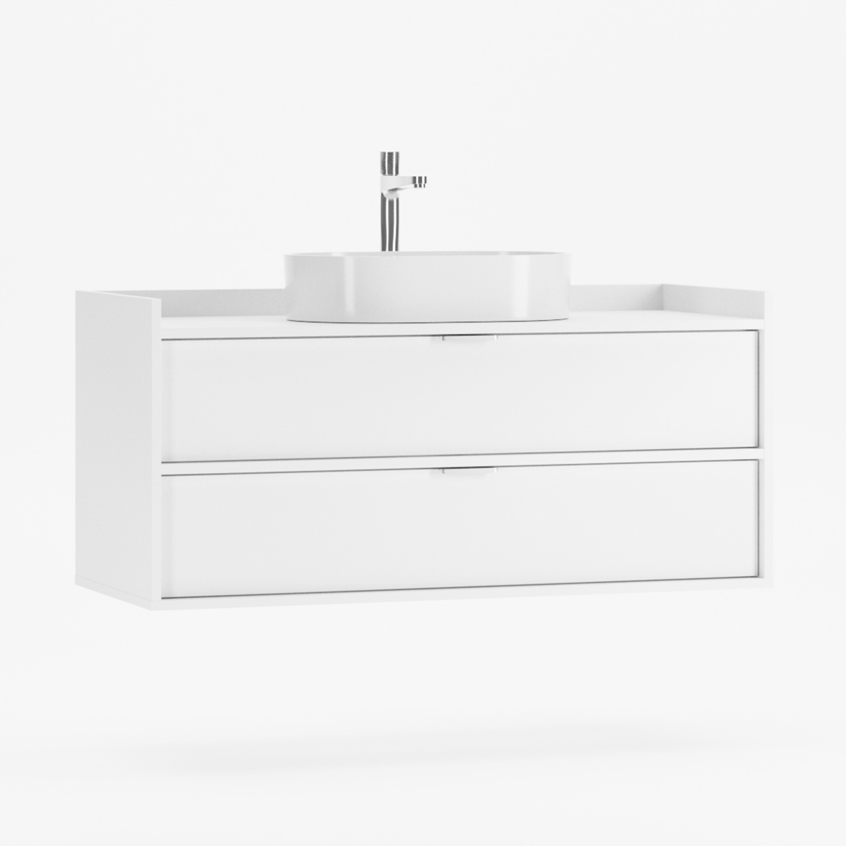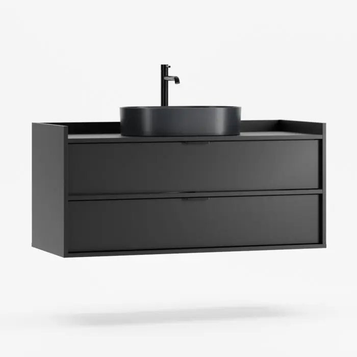 Den solide bordplaten har presis utskjæring for servant og vannlås, mens den høye bak- og sidekanten forhindrer at gjenstander faller og reduserer vannsprut. De karakteristiske frontene er trukket diskret tilbake og skaper et raffinert spill av lys og skygge.