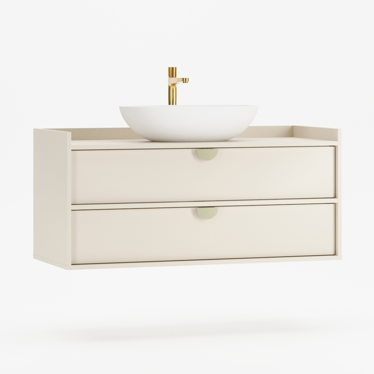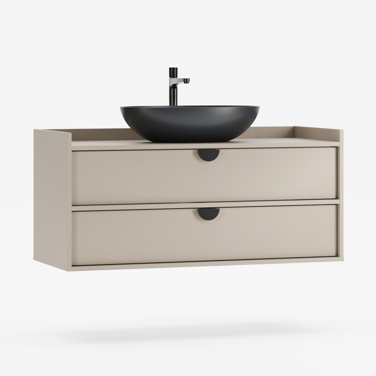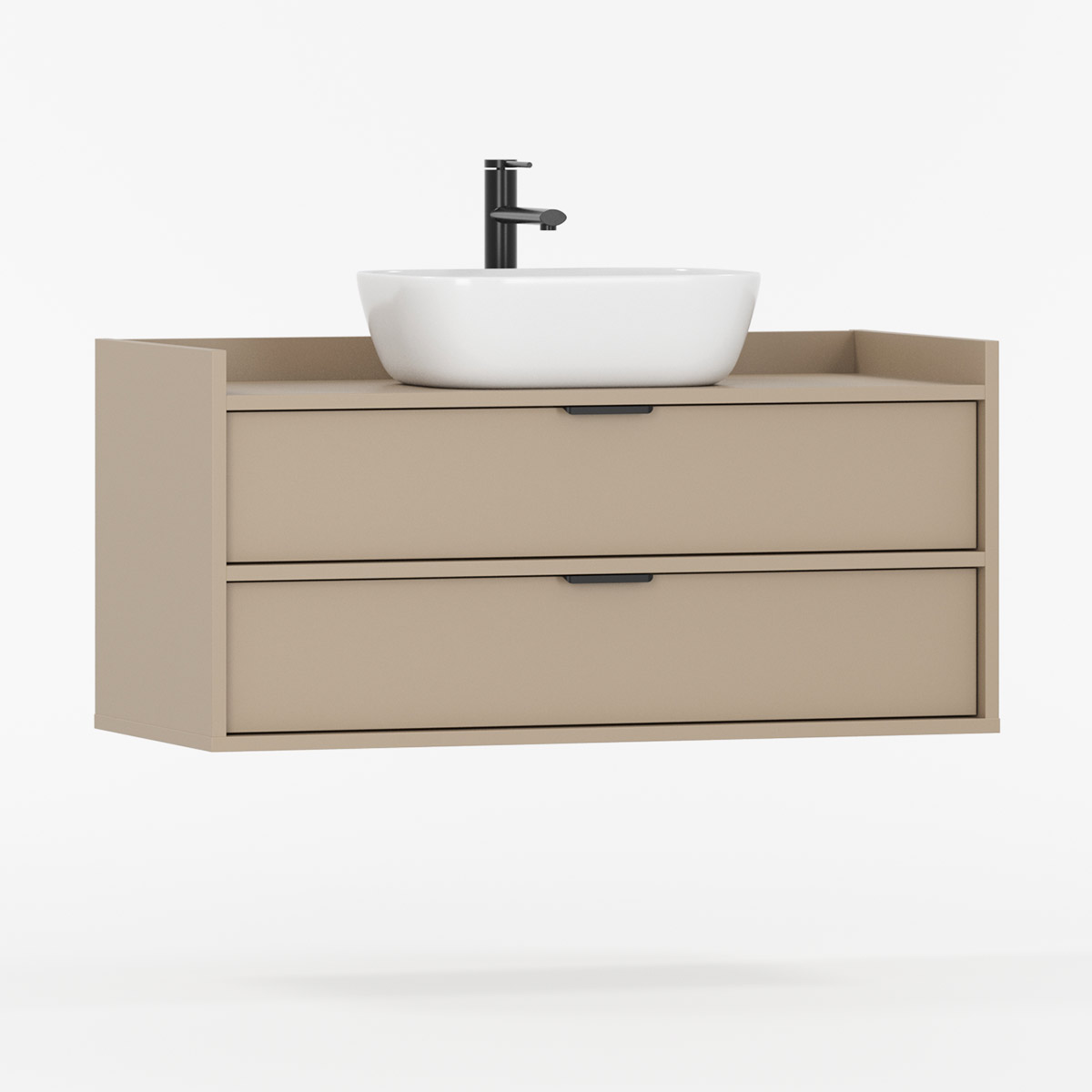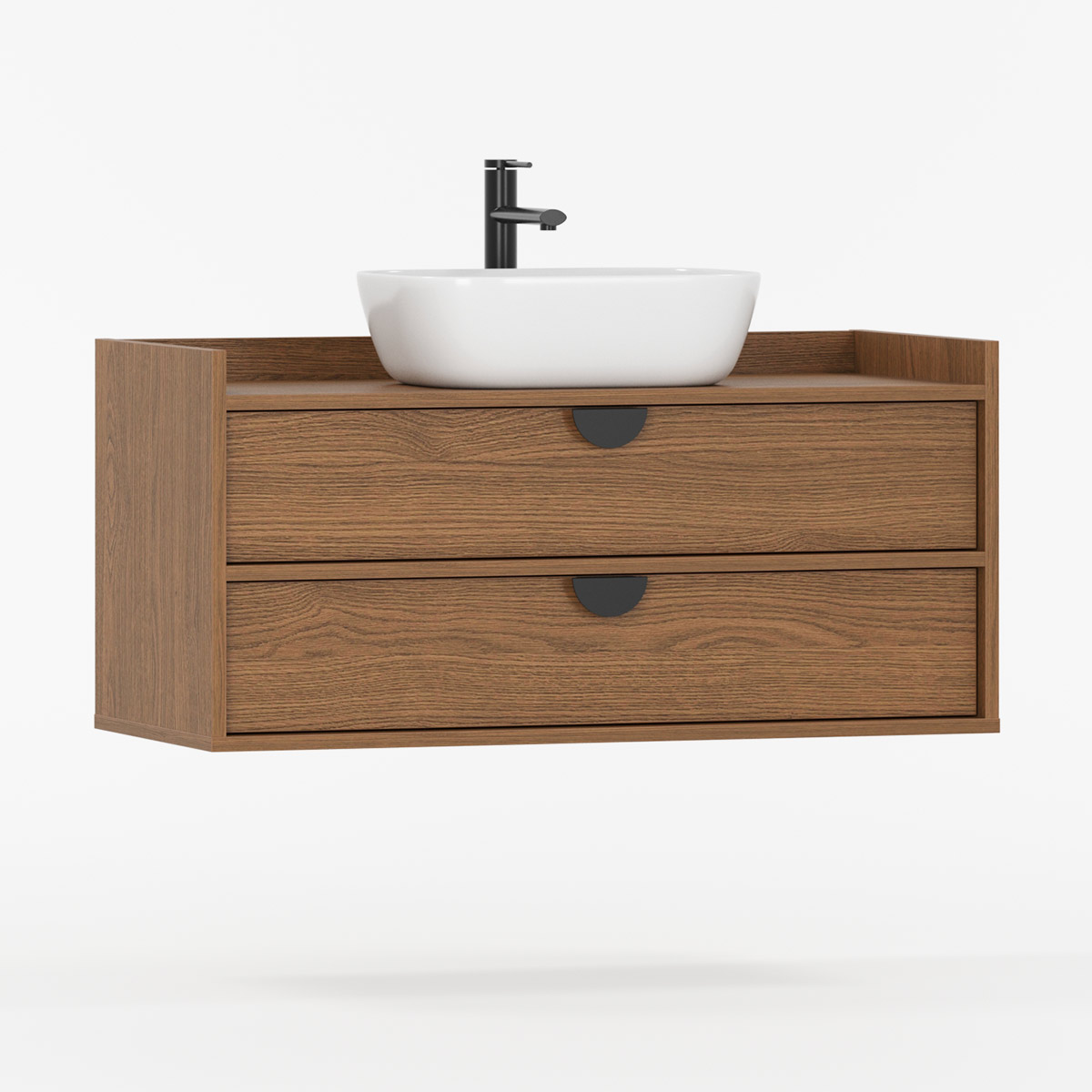 SIGI WSU02 kombinerer baderomsskap, keramisk servant og valgfri kran i ett harmonisk design som passer til både mindre og større baderom. De to romslige skuffene glir mykt på BLUM-skinner og gir god oppbevaring til kosmetikk og tilbehør.