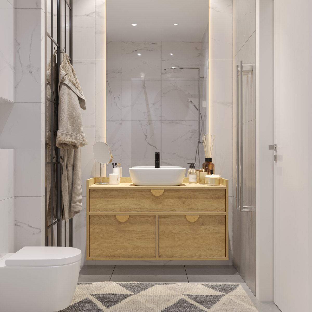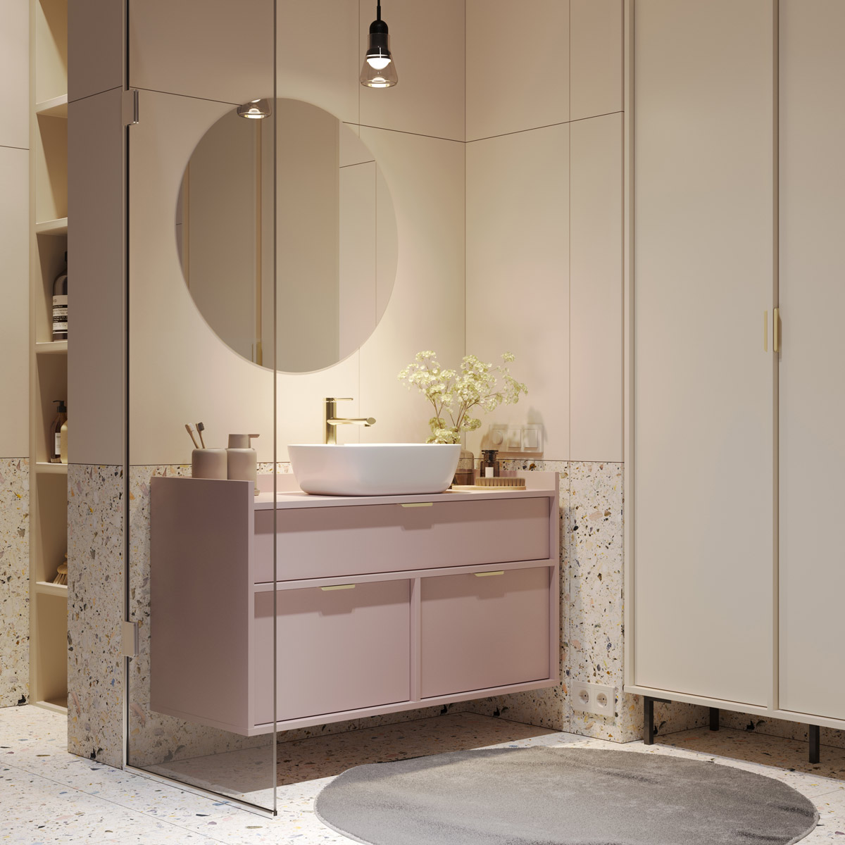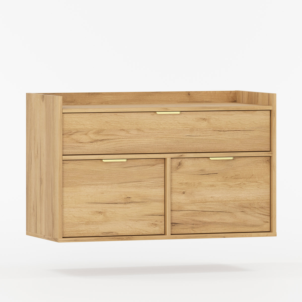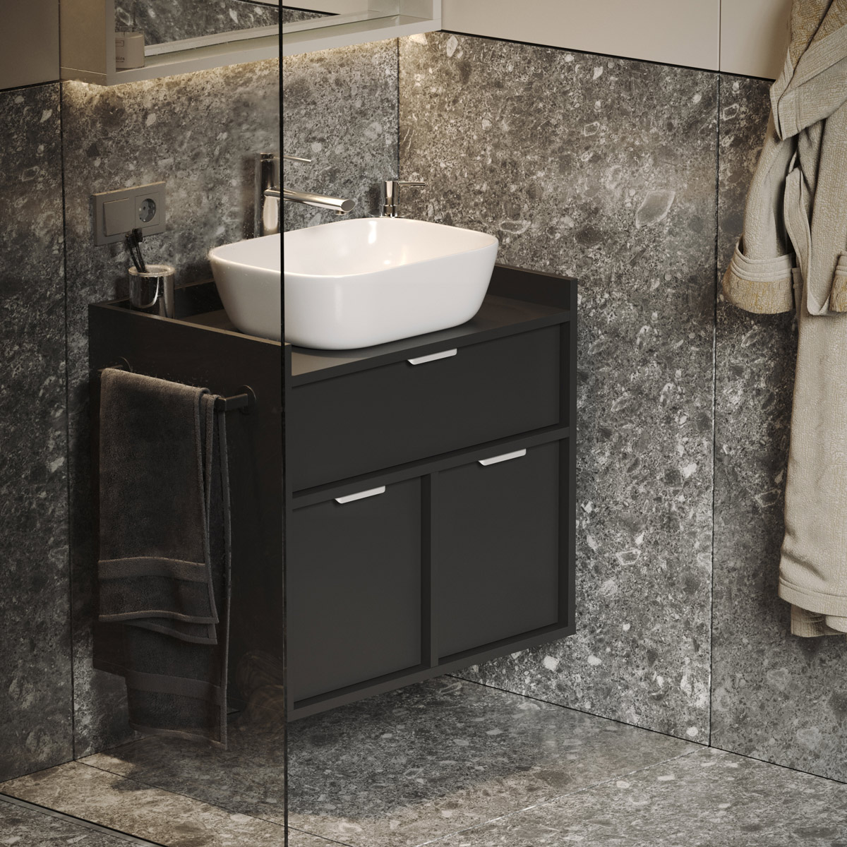 Tre romslige skuffer med BLUM-skinner glir lydløst og behagelig. Den øverste er spesialtilpasset vannlås, mens de to nederste gir rikelig plass til kosmetikk og tilbehør. De karakteristiske frontene er trukket diskret tilbake, og den høye bak- og sidekanten beskytter mot sprut.
