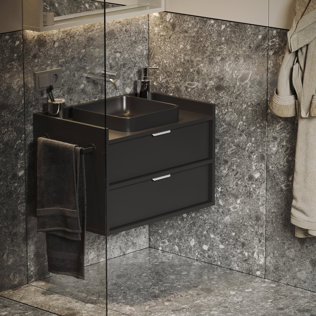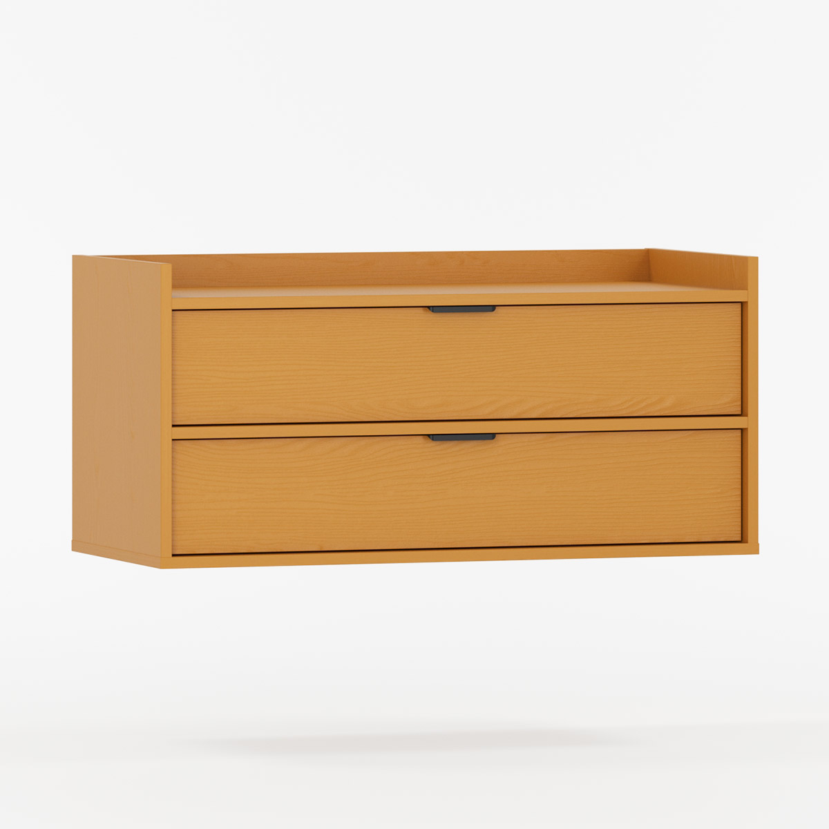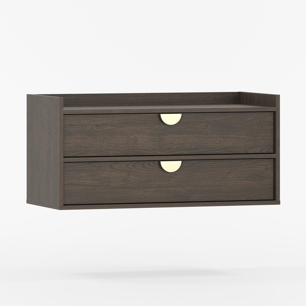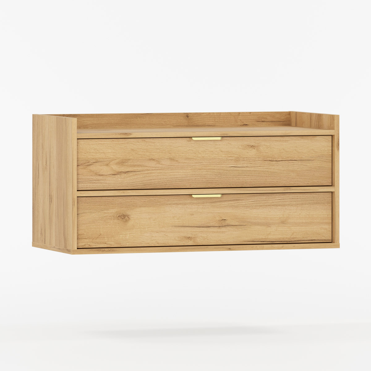 To praktiske skuffer med BLUM soft-close skinner gir lydløs og jevn åpning. Den øverste har utskjæring til vannlås, mens bunnskuffen gir god plass til kosmetikk og rengjøringsmidler. De karakteristiske frontene er trukket diskret tilbake med høy bak- og sidekant som beskytter mot sprut.