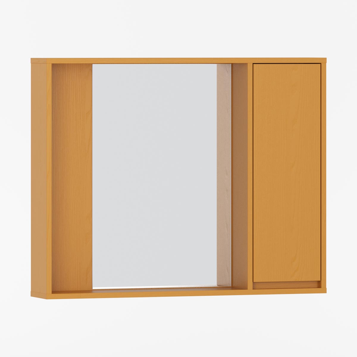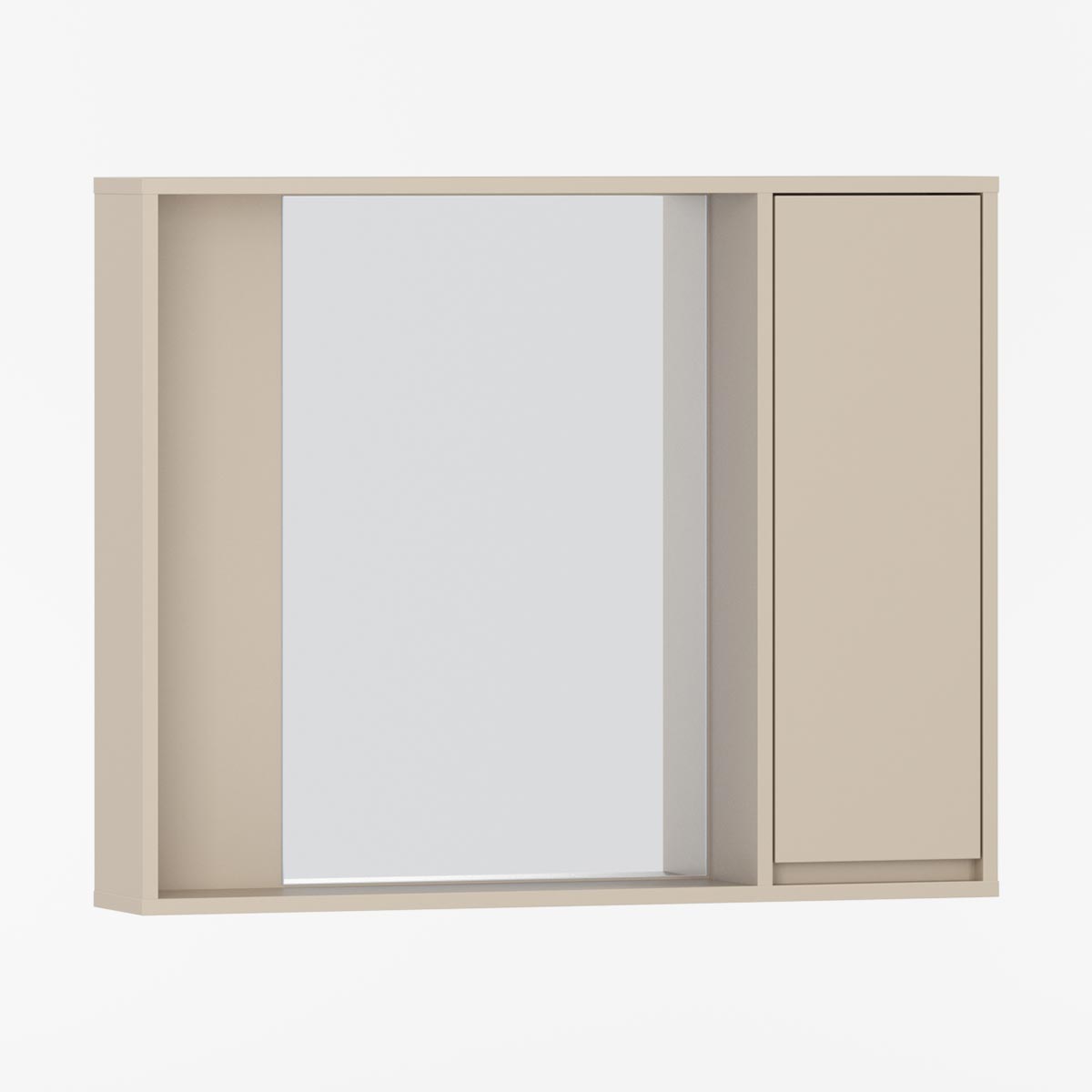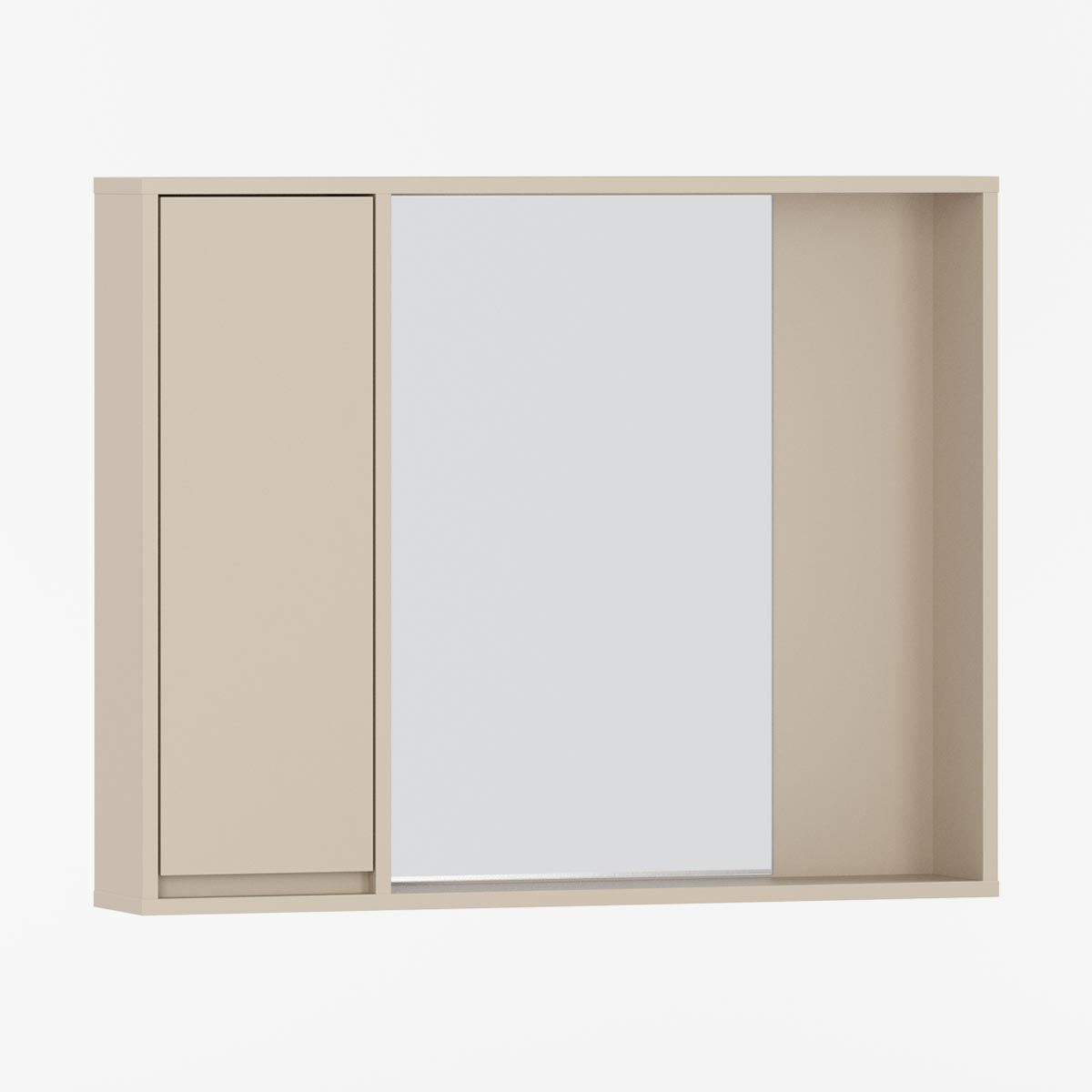 Skapet har et stort speil som gir romfølelse, supplert av en åpen hylle under – ideell for daglig bruk av kosmetikk eller småting. Det leveres i høyre- eller venstrevendt variant og kan bestilles i ønsket bredde, høyde, dybde og farge.