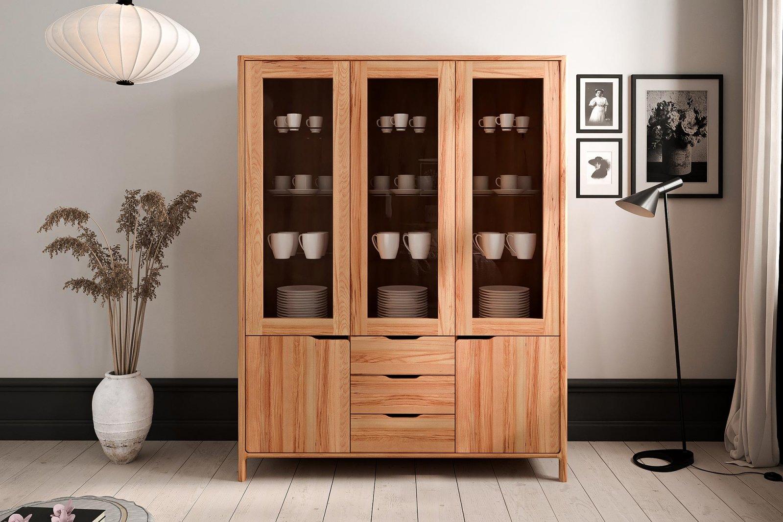 Vitrineskap TWIG – 140 cm bredt med glassdører, tredører og skuffer