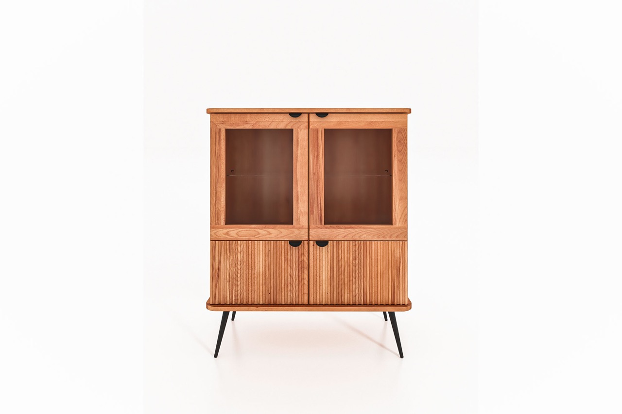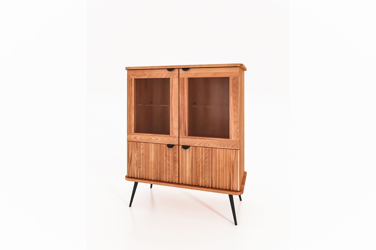 KULA-vitrineskapet forener det lette og det solide i en balansert form. Øverst to glassdører som fremhever det du ønsker å vise frem med lys og luft, nederst to riflede dører som skjuler det du vil ha nært.