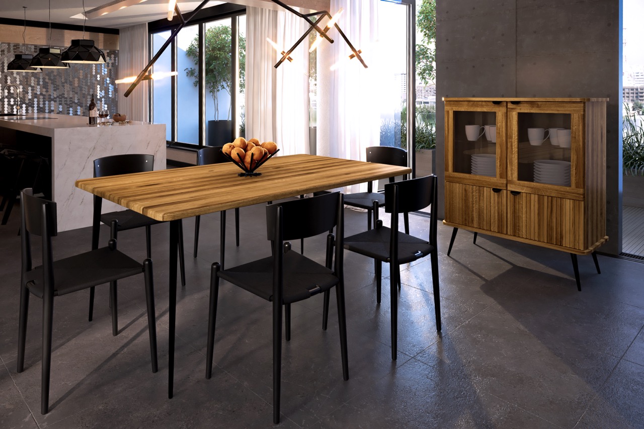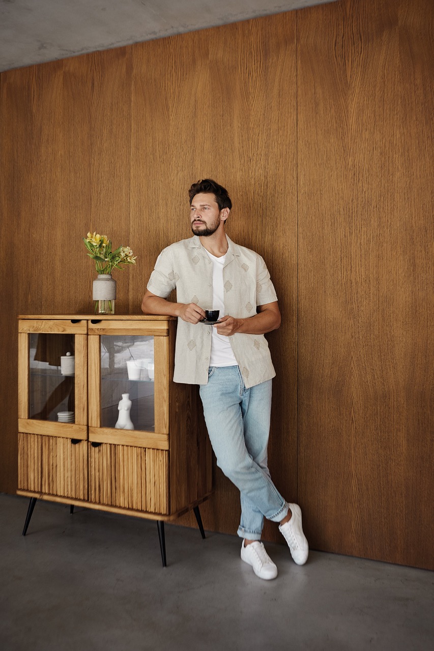Skapet er laget i massivt tre, eik eller bøk, og finnes i flere oljede overflater som fremhever materialets naturlige karakter og varme. Sorte håndtak og slanke metallben tilfører en moderne kontrast og gir møbelet en visuell letthet, samtidig som treverket skaper ro og nærvær.