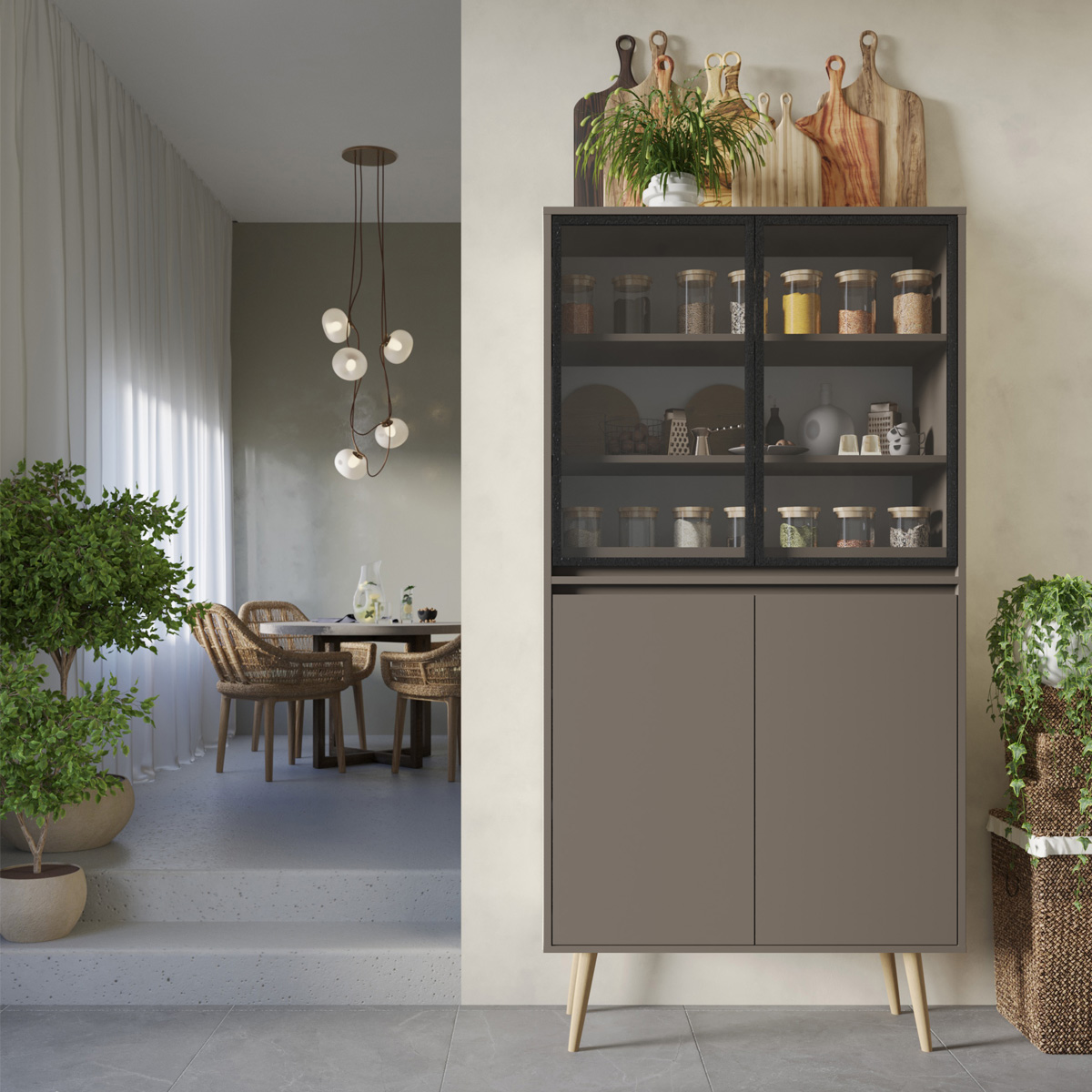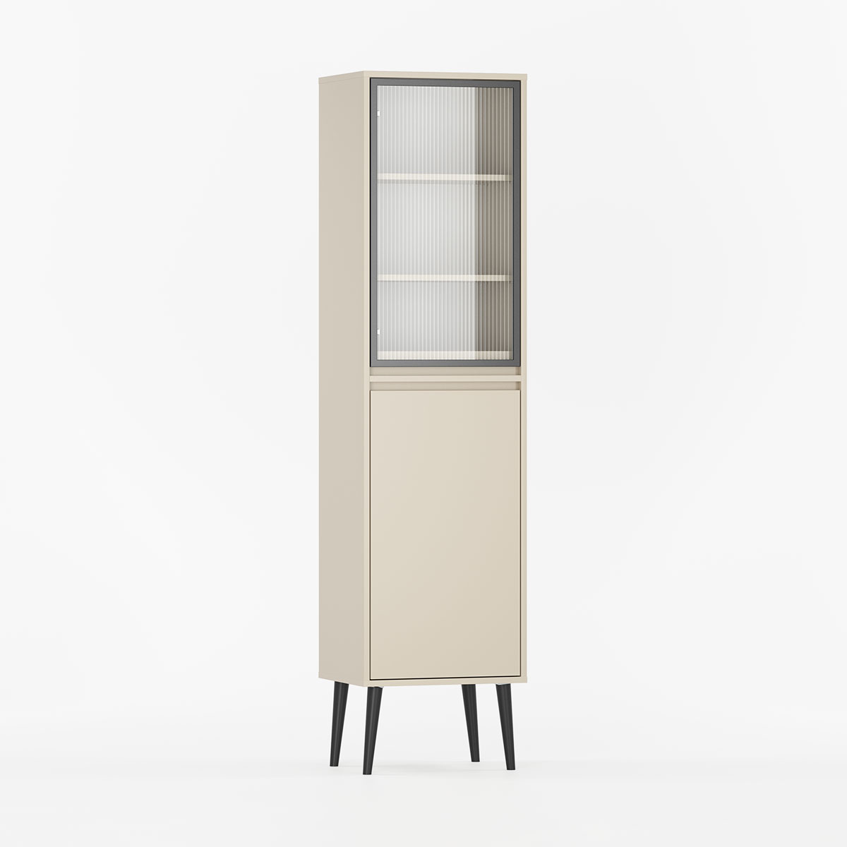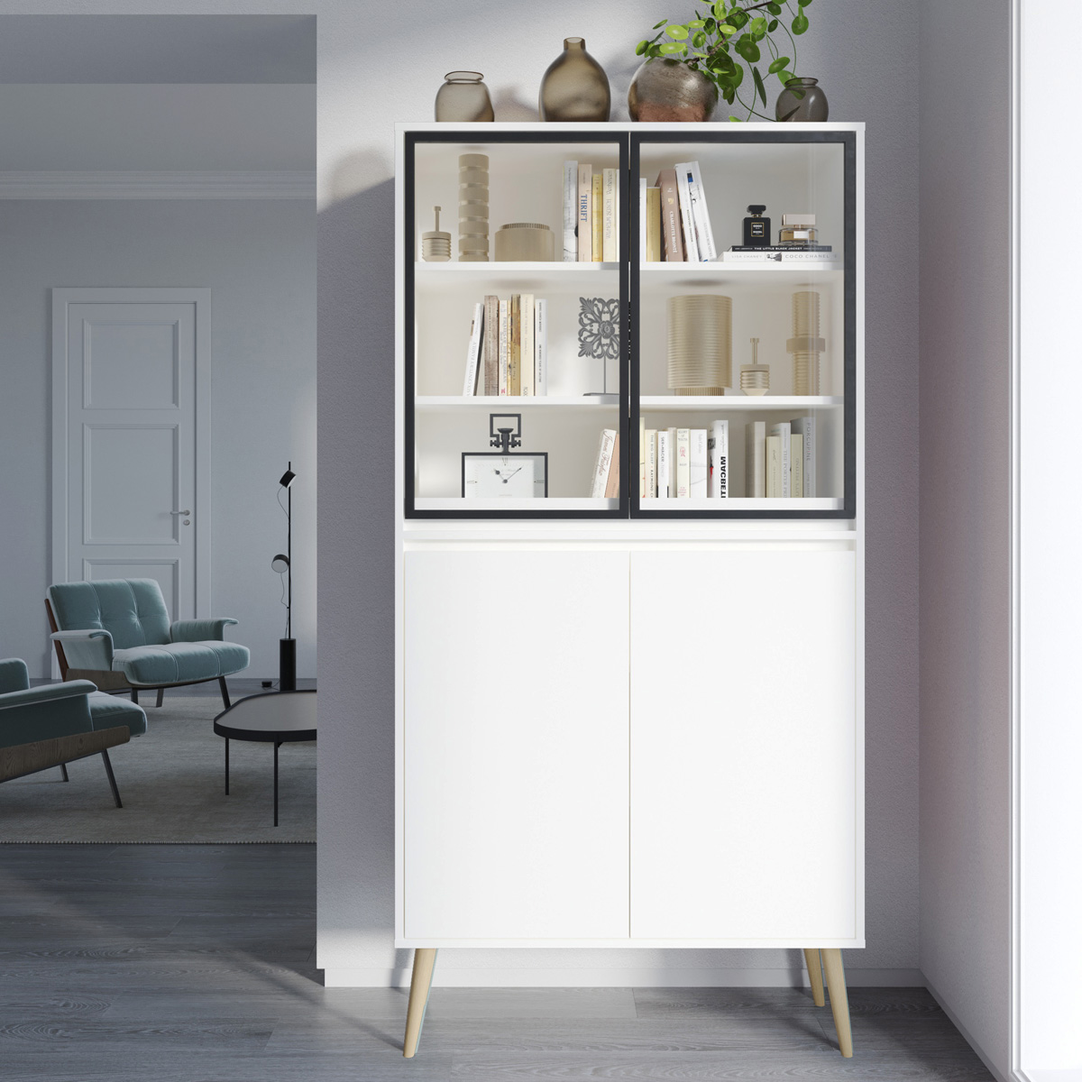 Øverst finner du en glassdør med justerbare hyller, mens den nedre delen har en diskret dør for ting du vil holde ute av syne. Du velger selv bredde, farger, ben og glasstype for å skape din egen versjon.