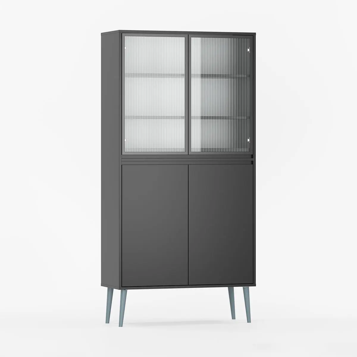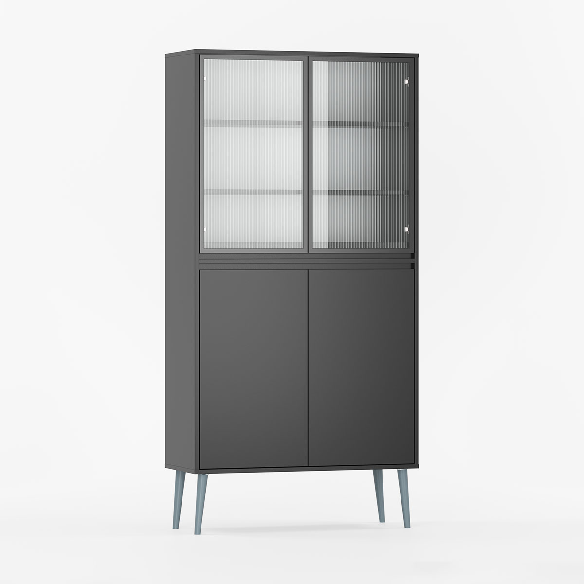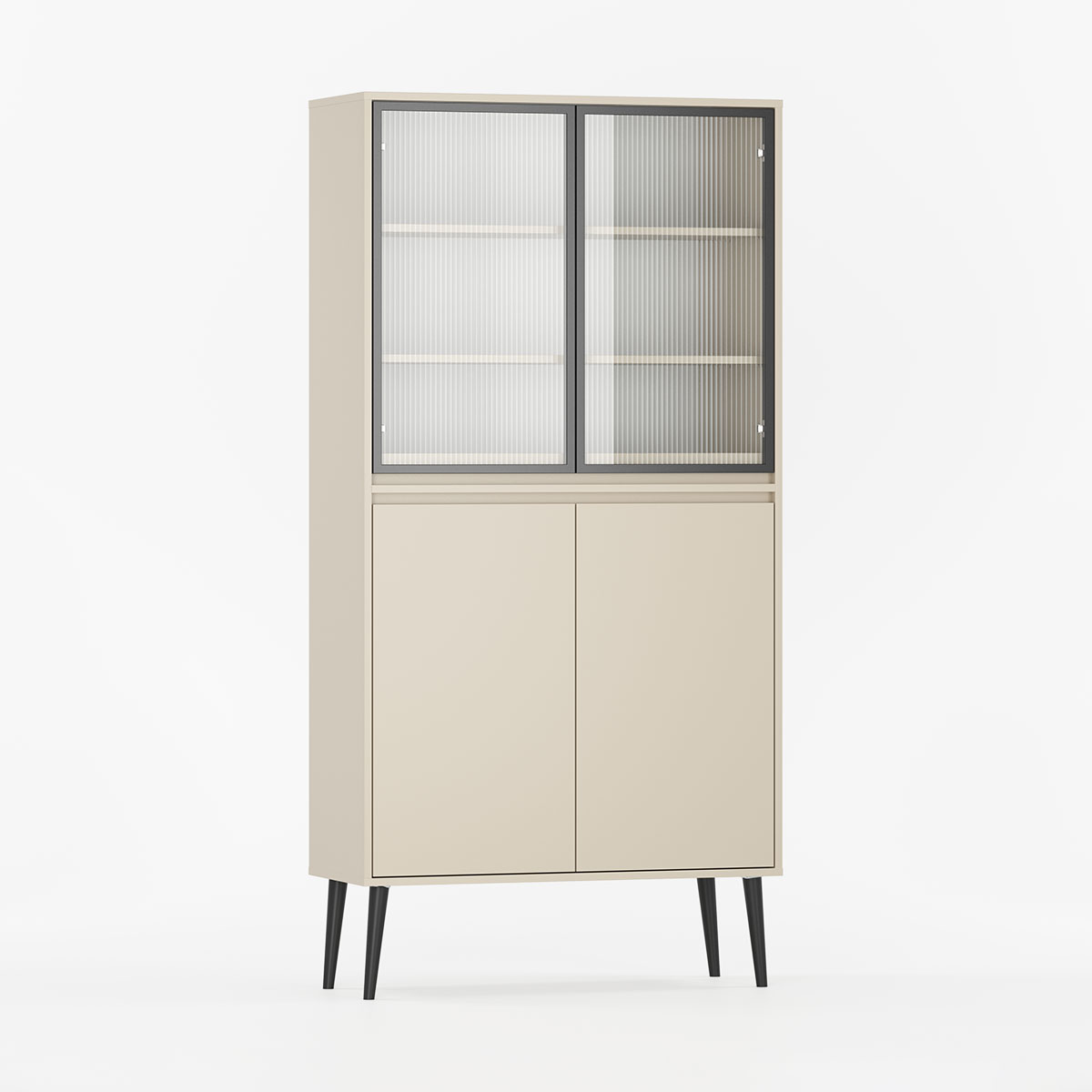 Øverst finner du en glassdør med justerbare hyller, mens den nedre delen har en diskret dør for ting du vil holde ute av syne. Du velger selv bredde, farger, ben og glasstype for å skape din egen versjon.