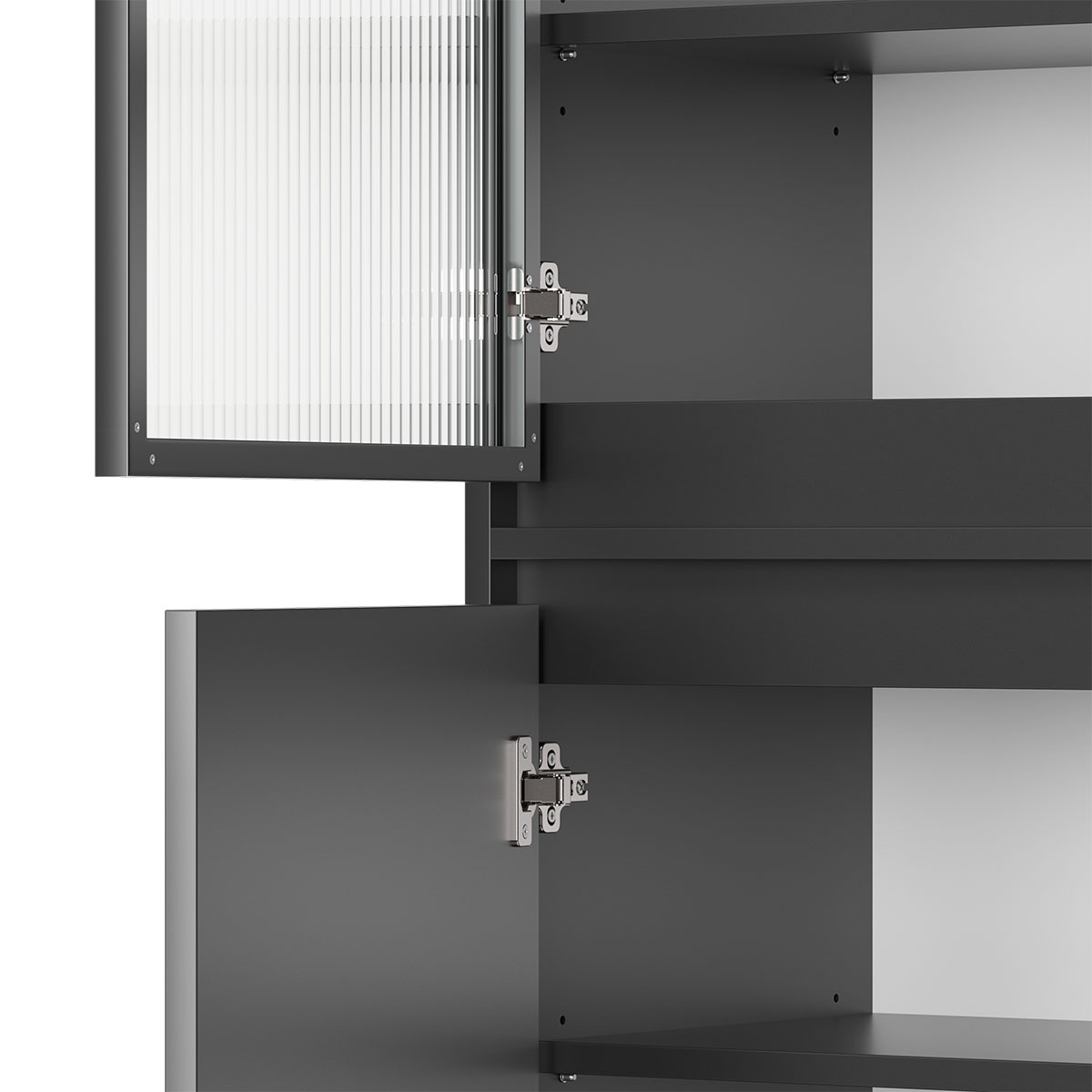 Øverst finner du en glassdør med flyttbare hyller, ideell for utstilling av gjenstander, mens nederste del har en lukket front for diskret lagring.