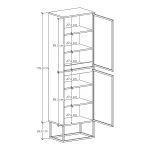 Metallprofilene som erstatter tradisjonelle ben gir et industrielt preg og sørger for stabilitet. Både øvre og nedre del har glassdører med flyttbare hyller, noe som gir fleksibilitet i bruken.