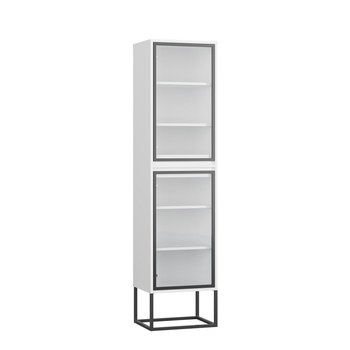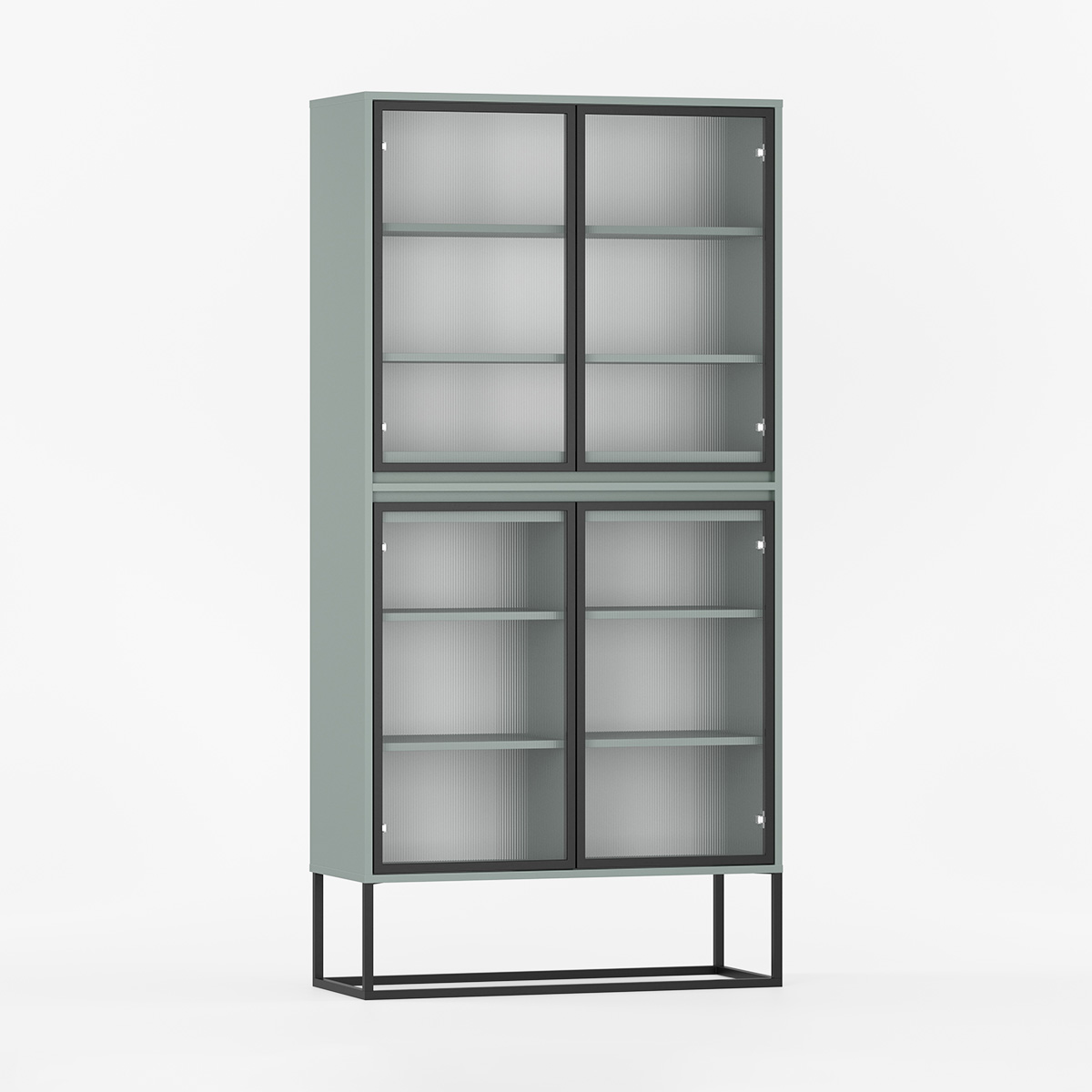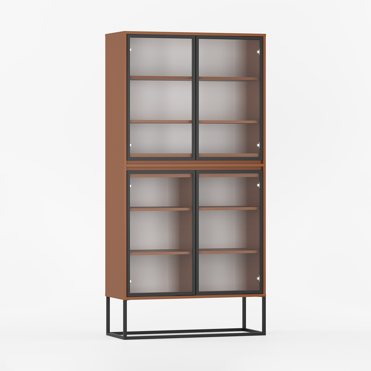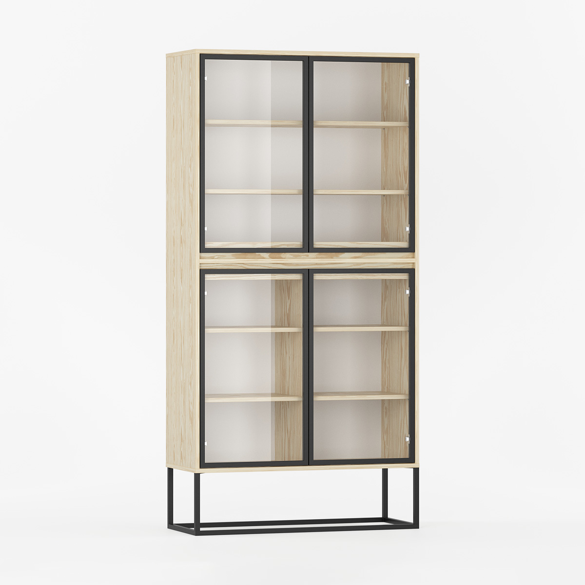 Metallprofilene som erstatter tradisjonelle ben gir et industrielt preg og sørger for stabilitet. Både øvre og nedre del har glassdører med flyttbare hyller, noe som gir fleksibilitet i bruken.