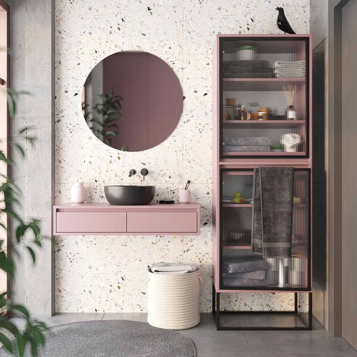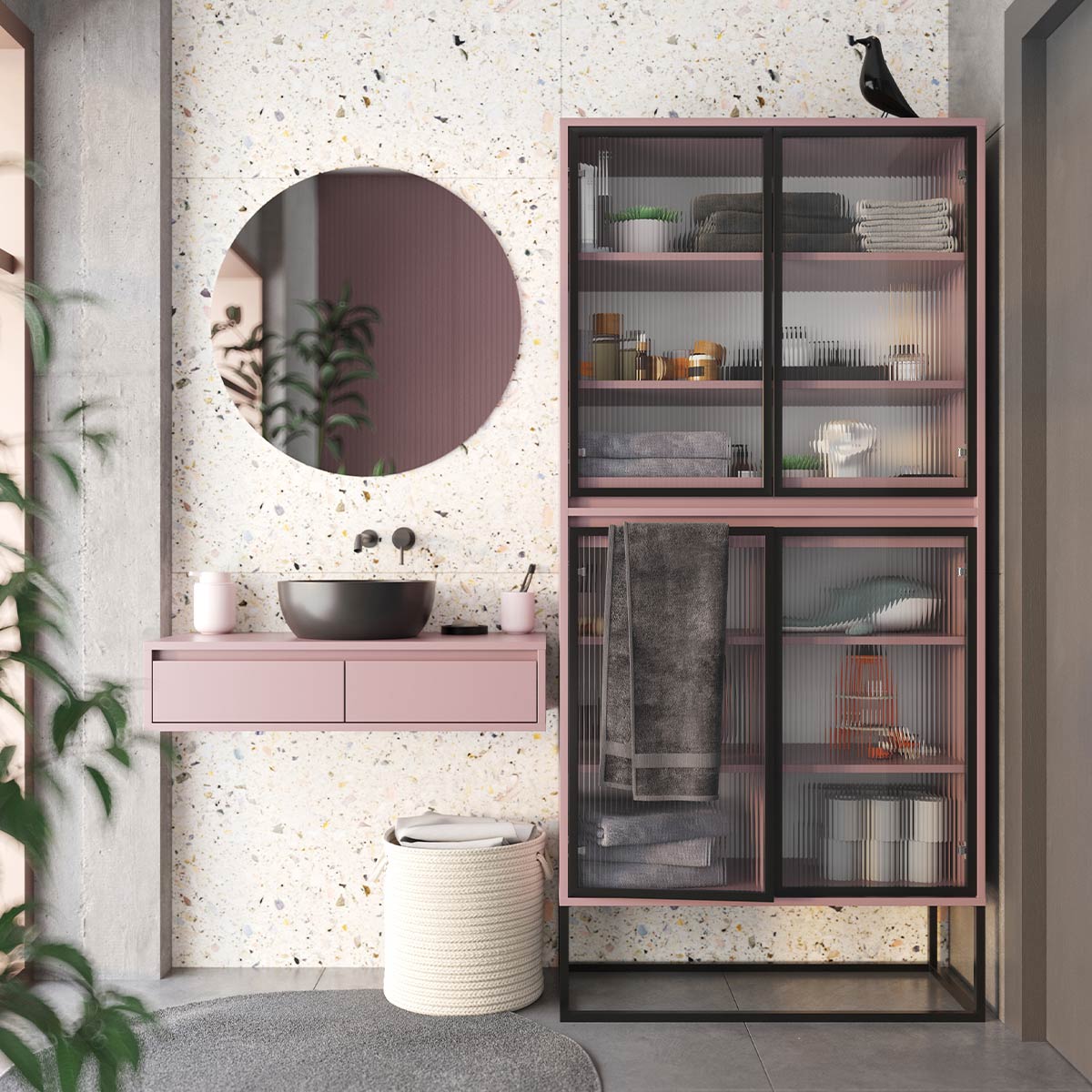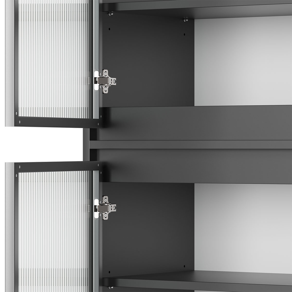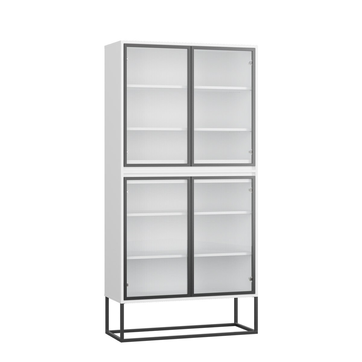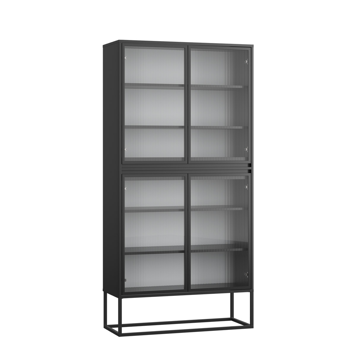 Metallprofilene som erstatter tradisjonelle ben gir et industrielt preg og sørger for stabilitet. Både øvre og nedre del har glassdører med flyttbare hyller, noe som gir fleksibilitet i bruken.