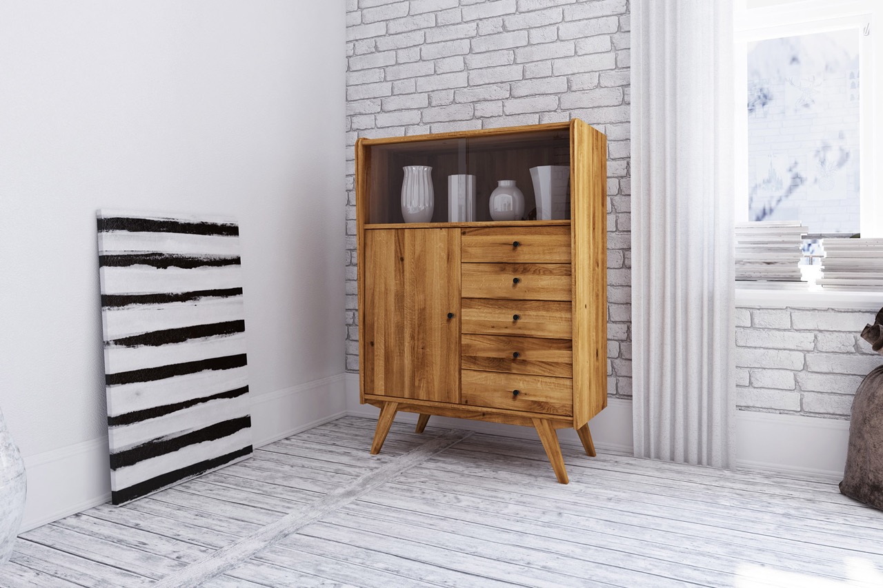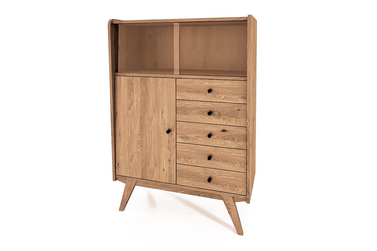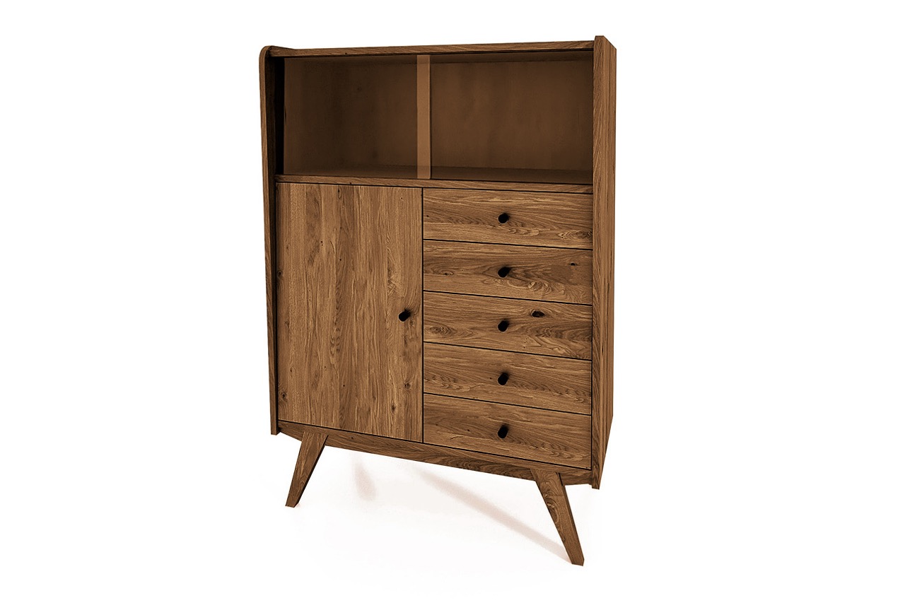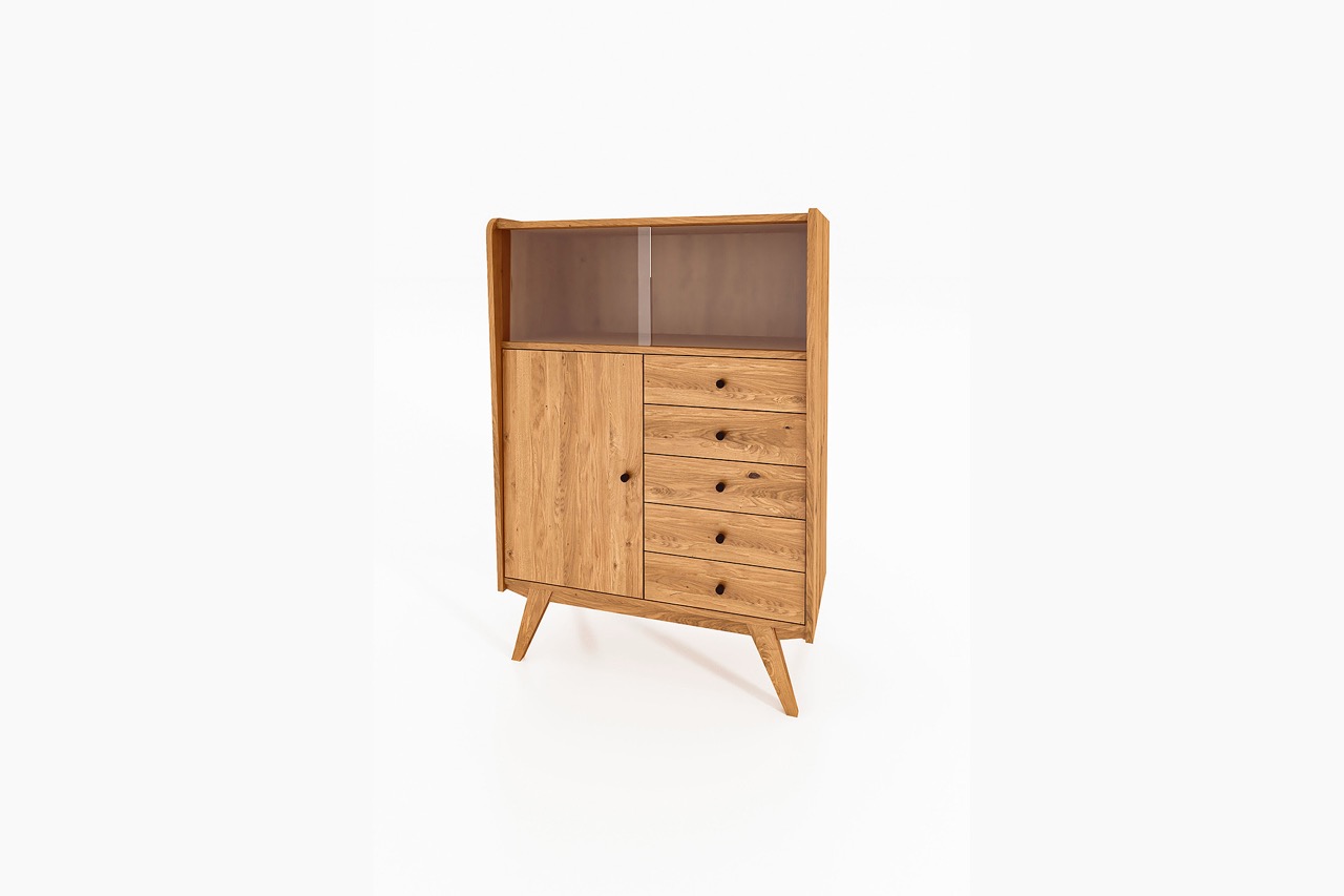 Med sine rene linjer, skrå ben og varme tretoner i oljet eik eller bøk bringer skapet et snev av retro inn i ethvert moderne hjem. Et møbel med tydelig karakter som passer like godt i stuen som i entréen eller kjøkkenet.