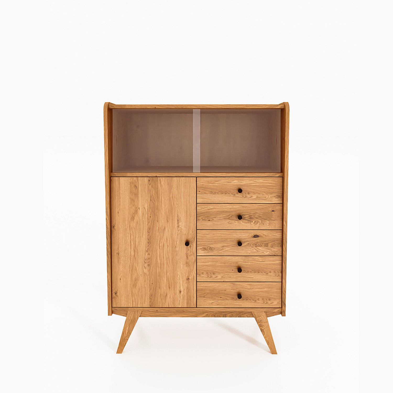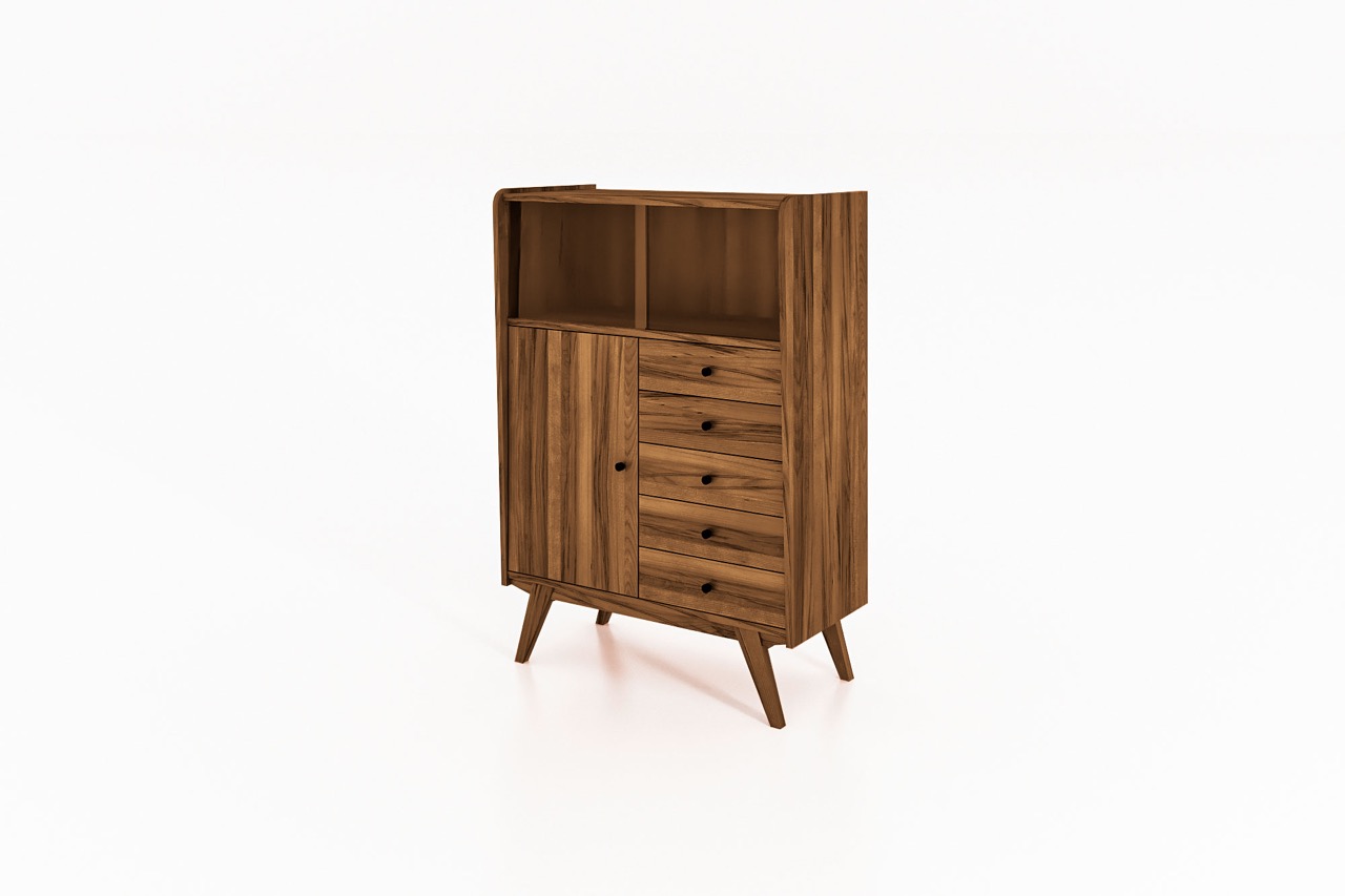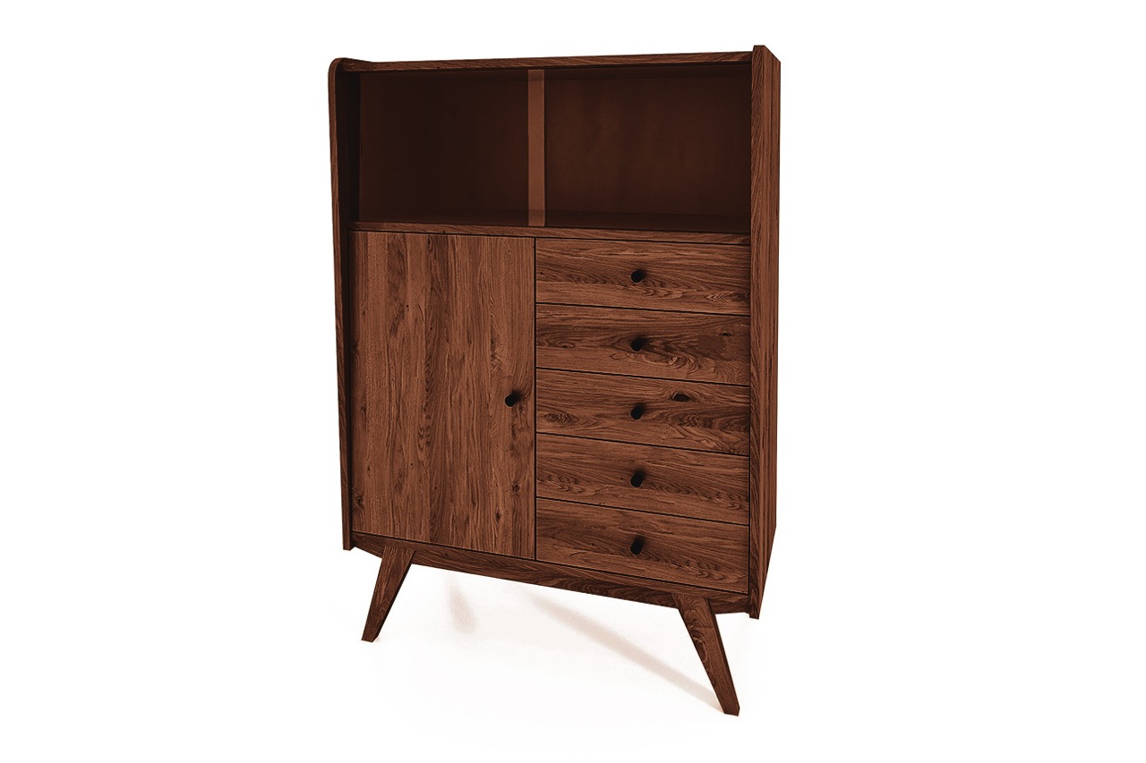 Med sine rene linjer, skrå ben og varme tretoner i oljet eik eller bøk bringer skapet et snev av retro inn i ethvert moderne hjem. Et møbel med tydelig karakter som passer like godt i stuen som i entréen eller kjøkkenet.