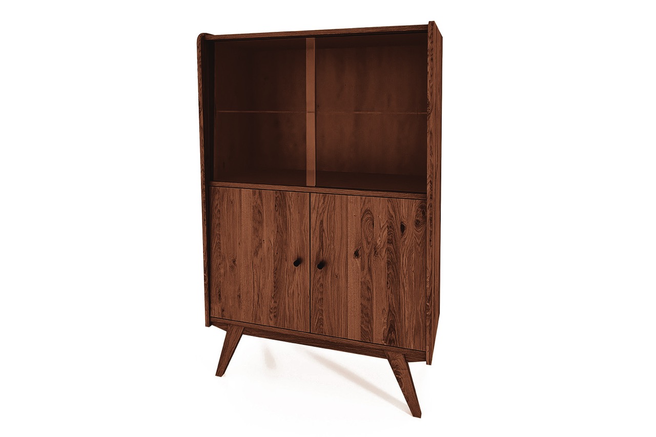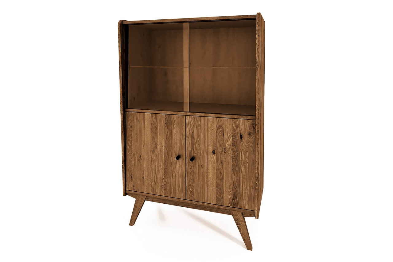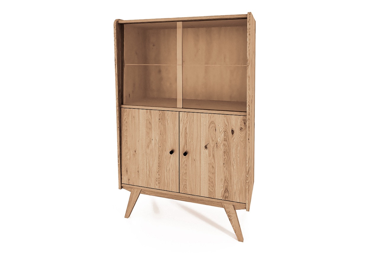 Nederste del med to tredører skjuler det du ikke vil ha stående fremme. Det tidløse uttrykket, de skrå benene og det massive treet i eik eller bøk gjør dette skapet til et karakterfullt møbel som passer perfekt i både stue, spisestue eller kjøkken.