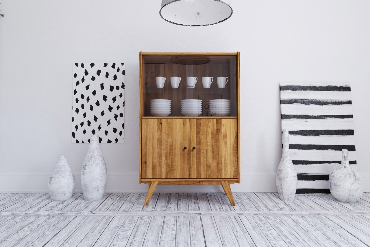RETRO vitrineskap kombinerer moderne retrodesign med funksjonell oppbevaring. Øverste del med glassdører og glasshylle gir deg mulighet til å vise frem dine vakreste ting – fra keramikk og bøker til dekorasjon og service.