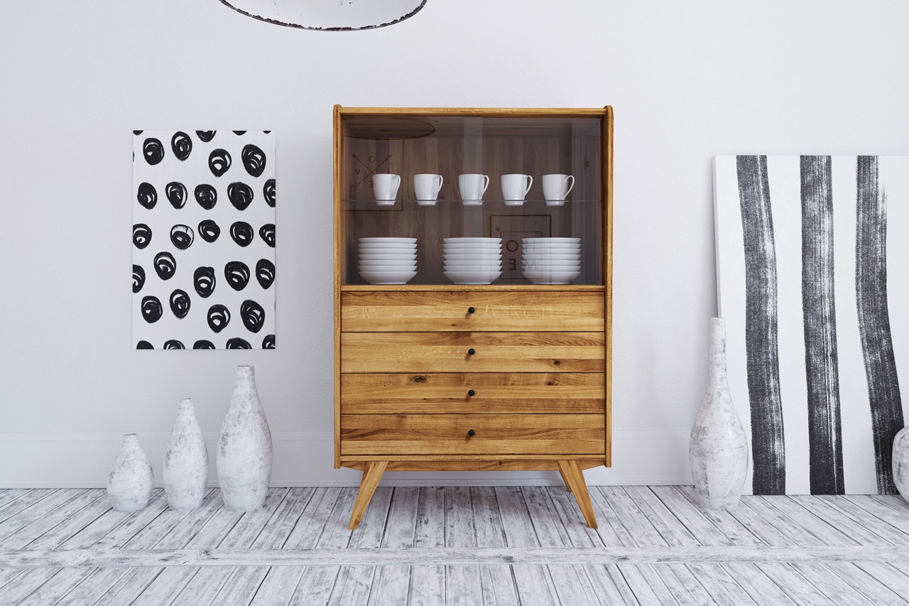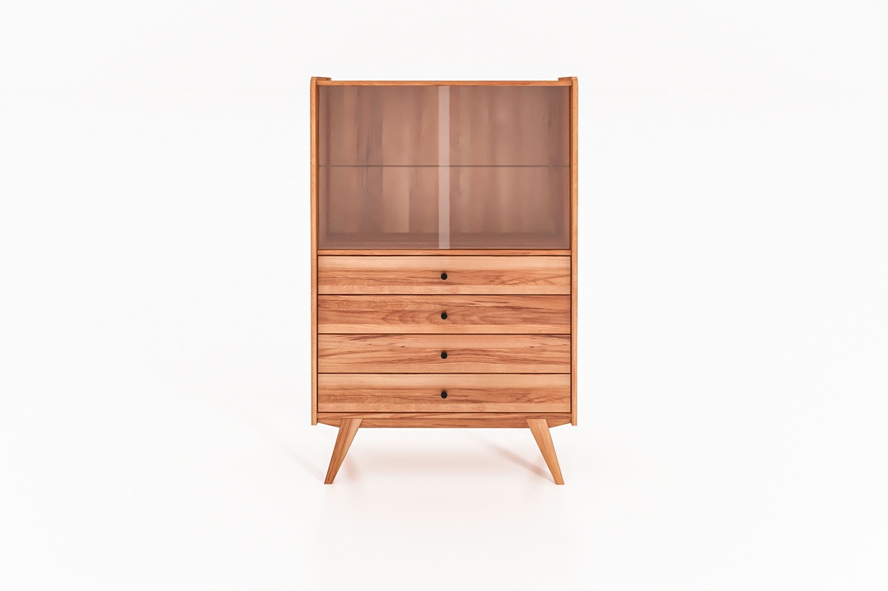 Vitrineskap RETRO – Med glassdører og fire skuffer
