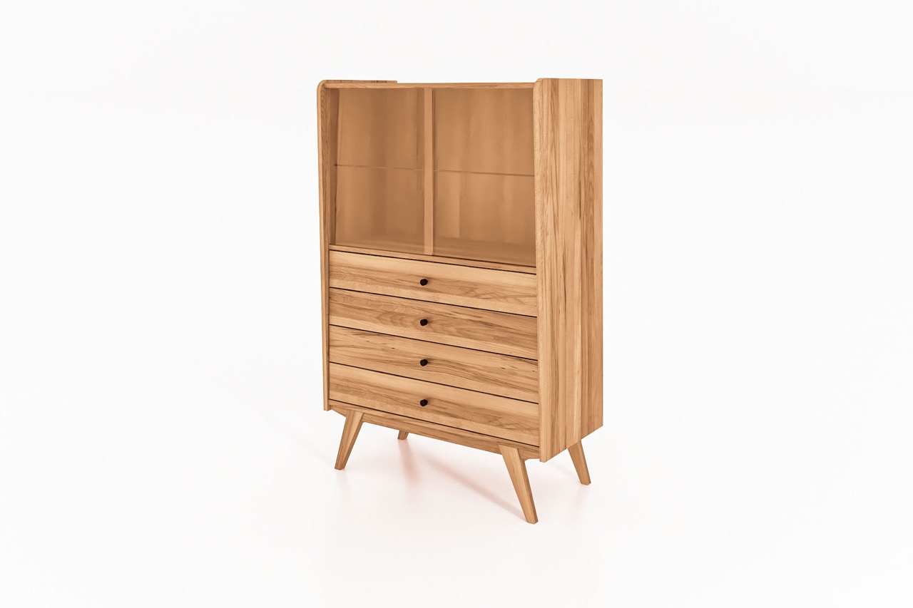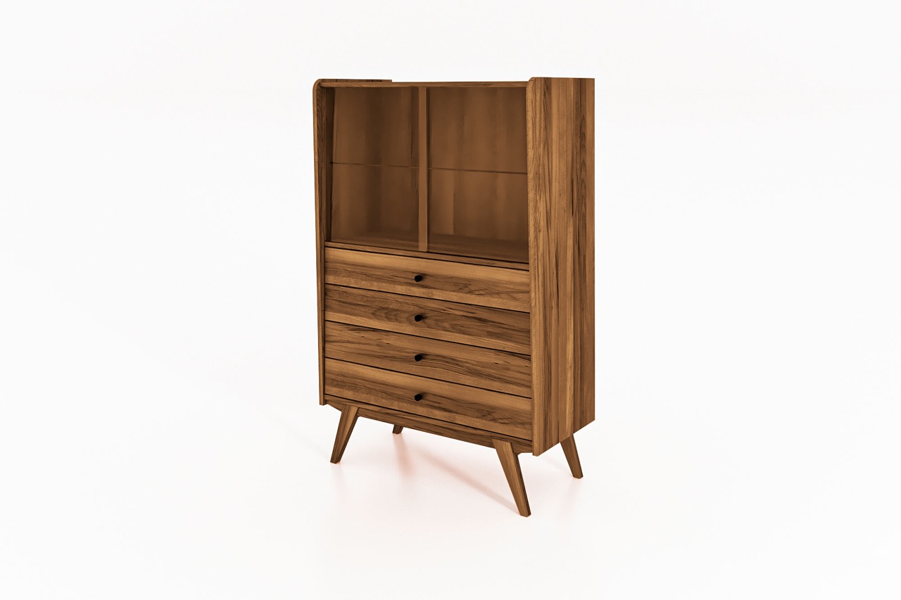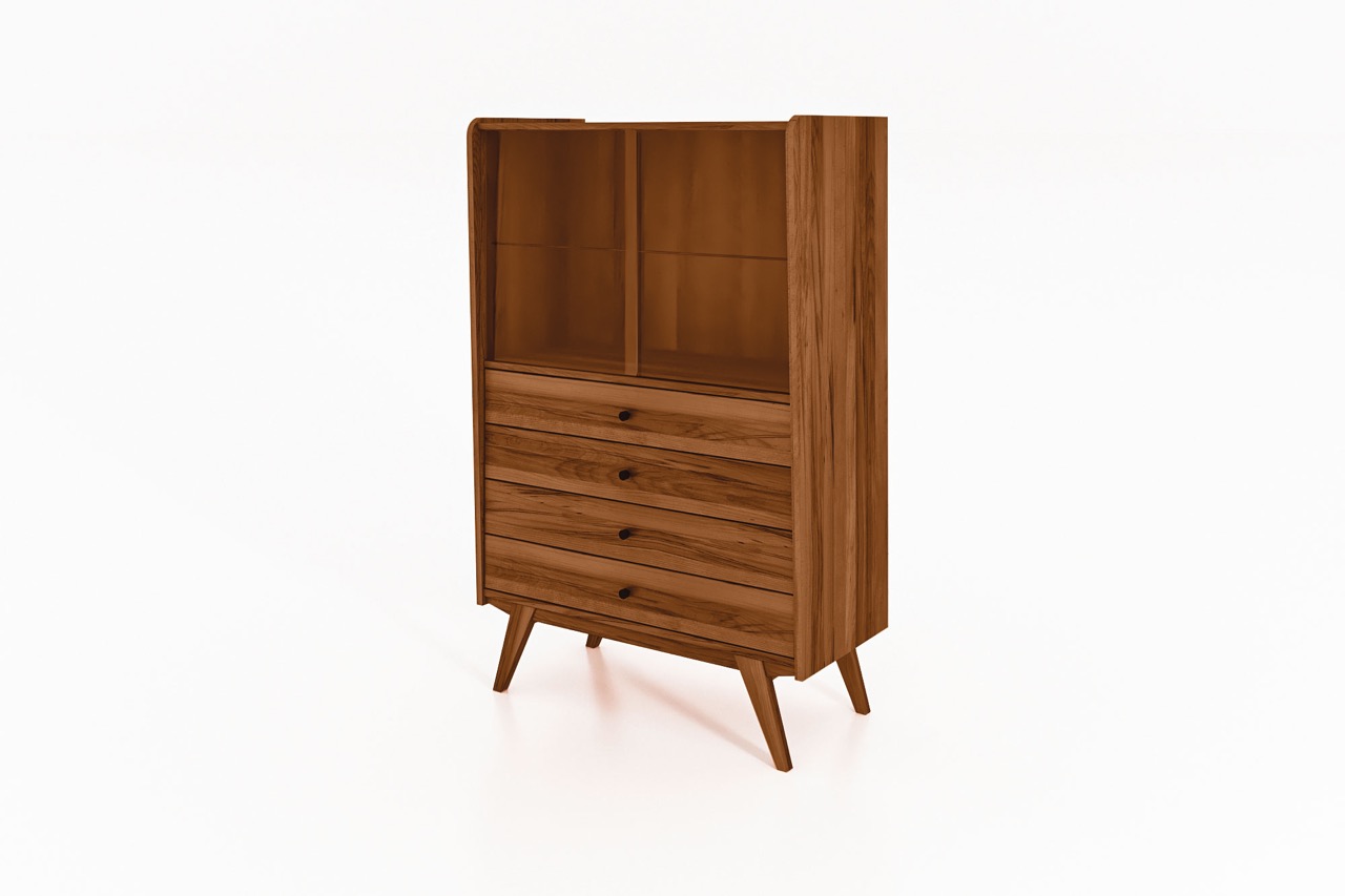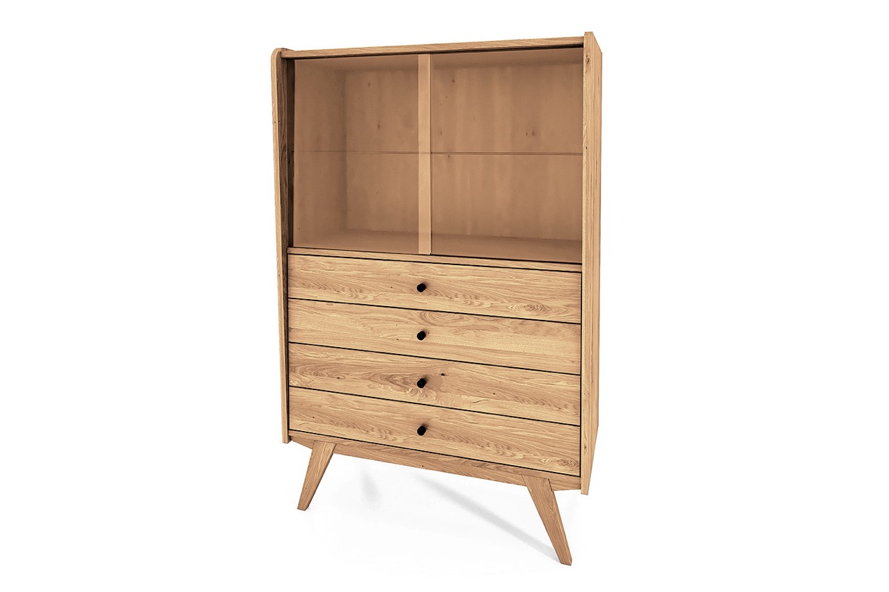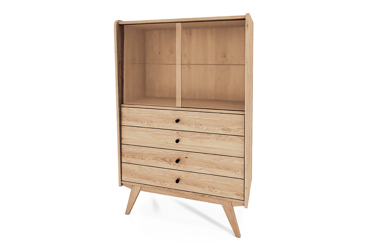 Det massive treet og de karakteristiske skrå benene gir skapet et retroinspirert uttrykk med moderne letthet. En harmonisk løsning til stuen, spisestuen eller entréen – hvor funksjon og form møtes.