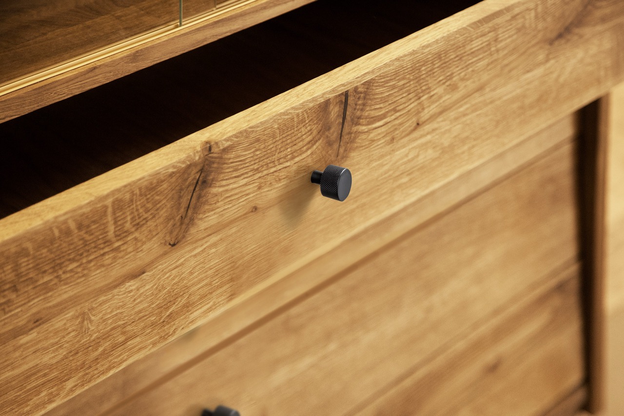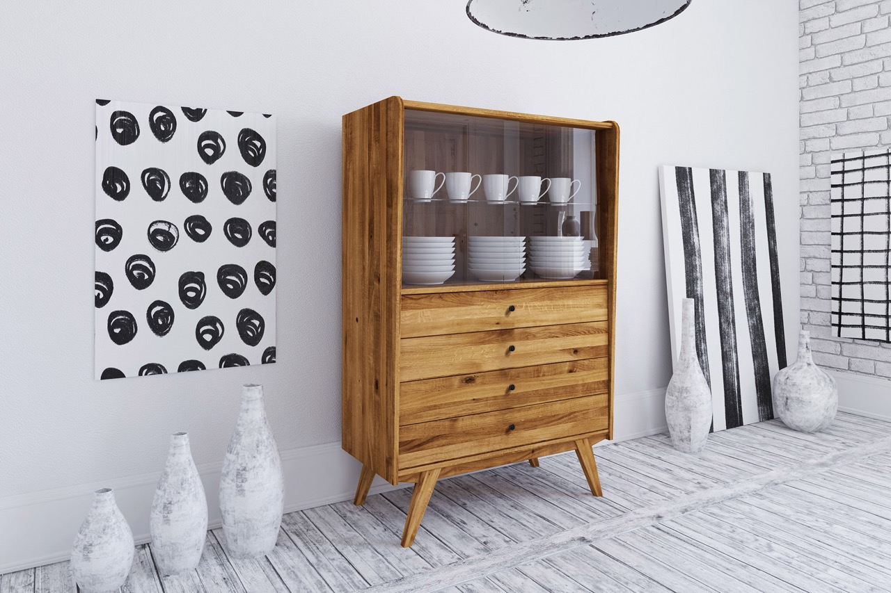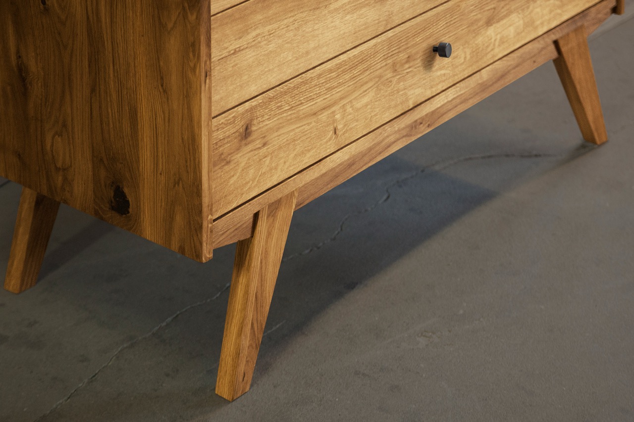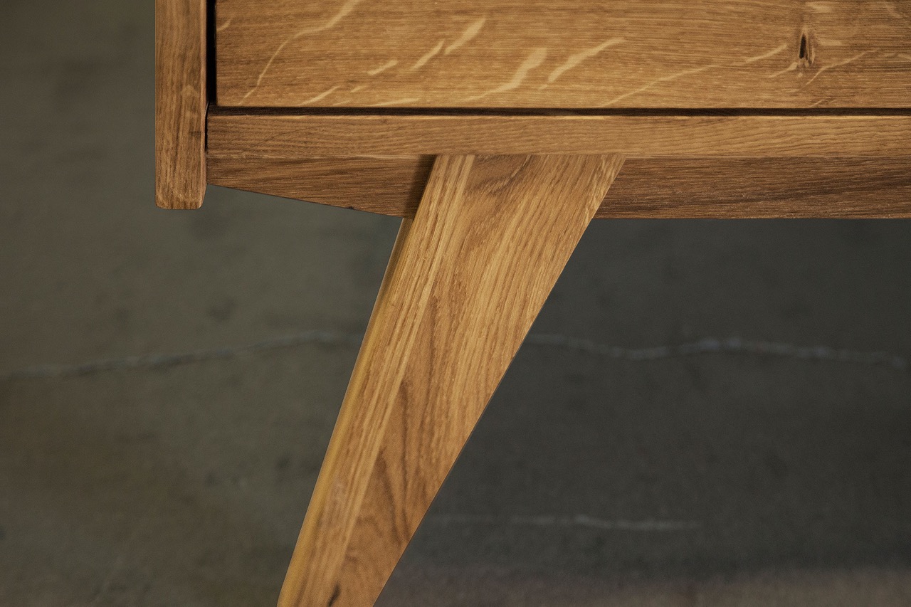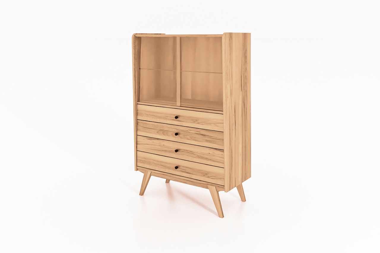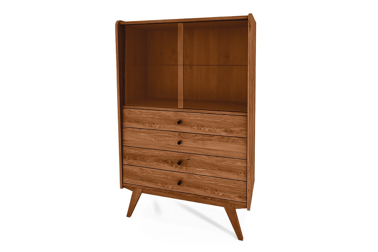 Det massive treet og de karakteristiske skrå benene gir skapet et retroinspirert uttrykk med moderne letthet. En harmonisk løsning til stuen, spisestuen eller entréen – hvor funksjon og form møtes.