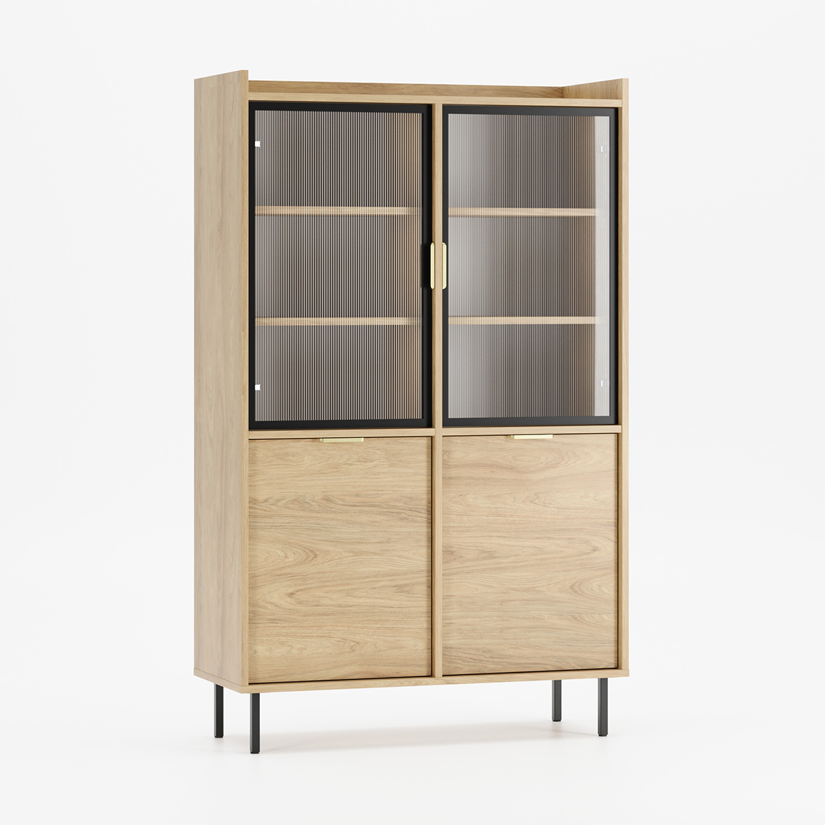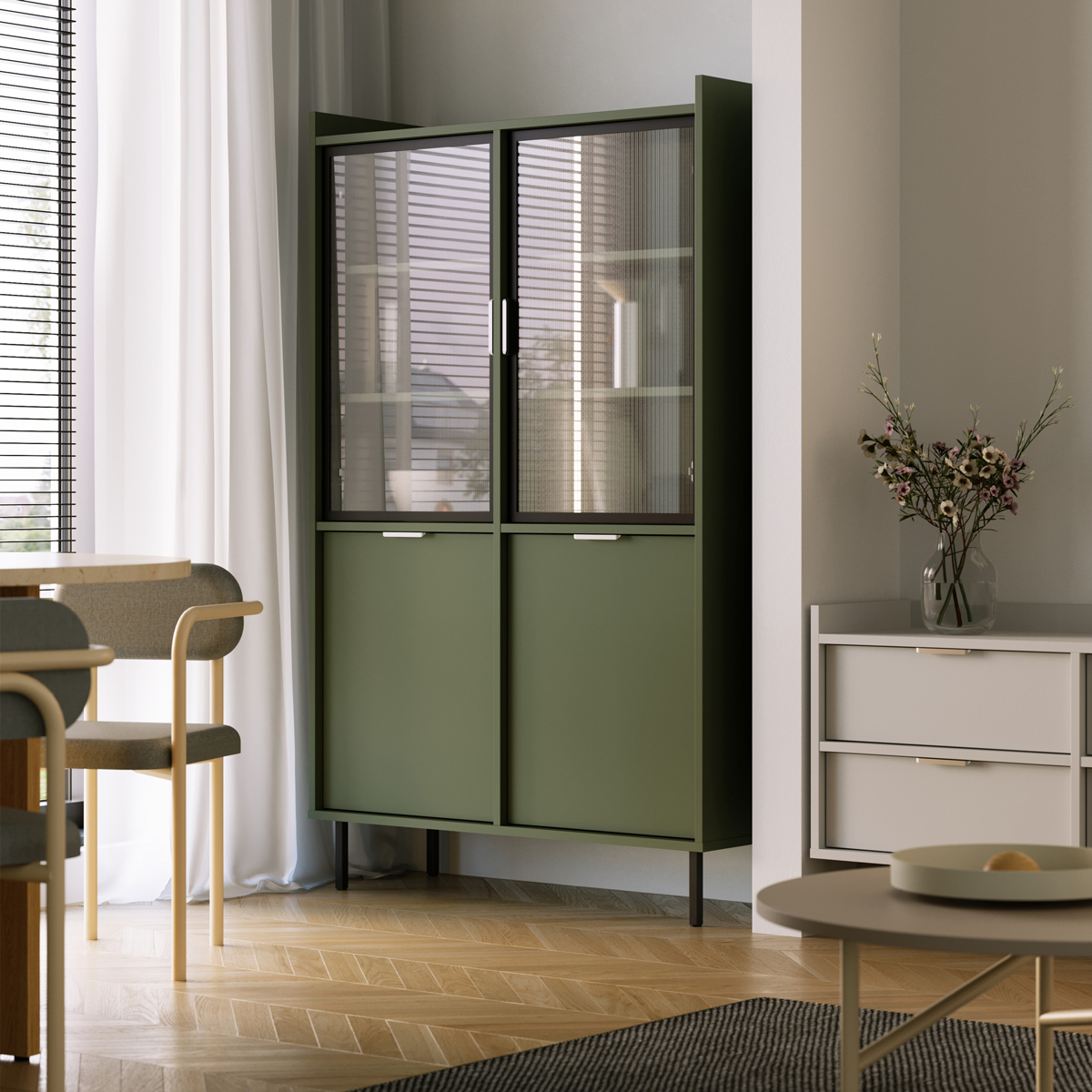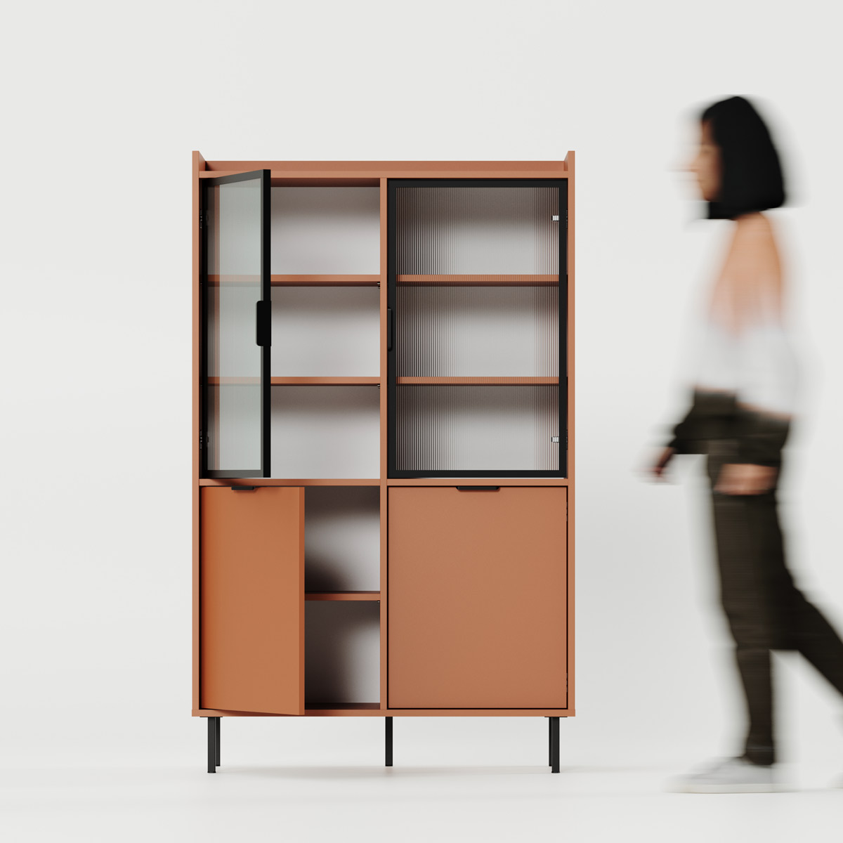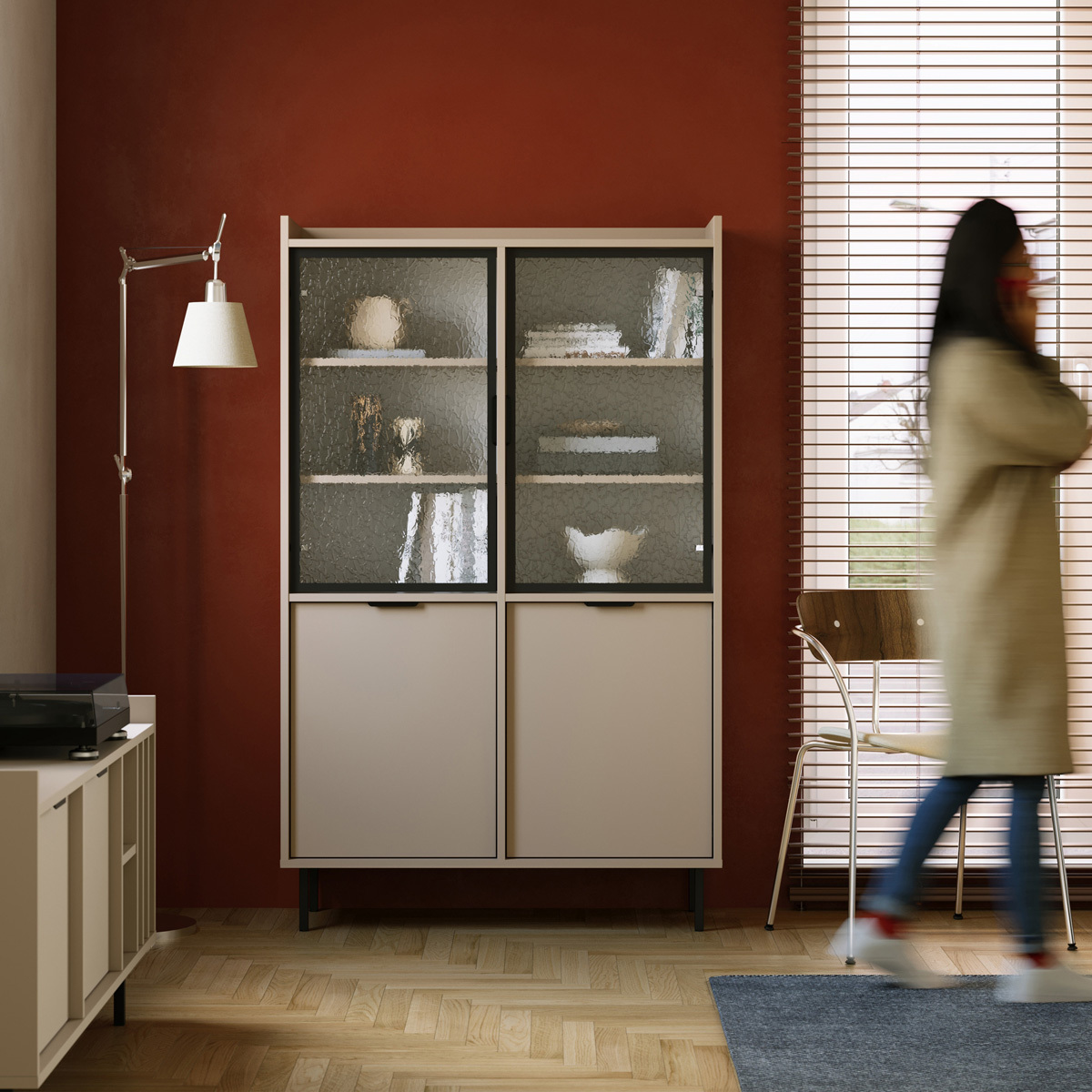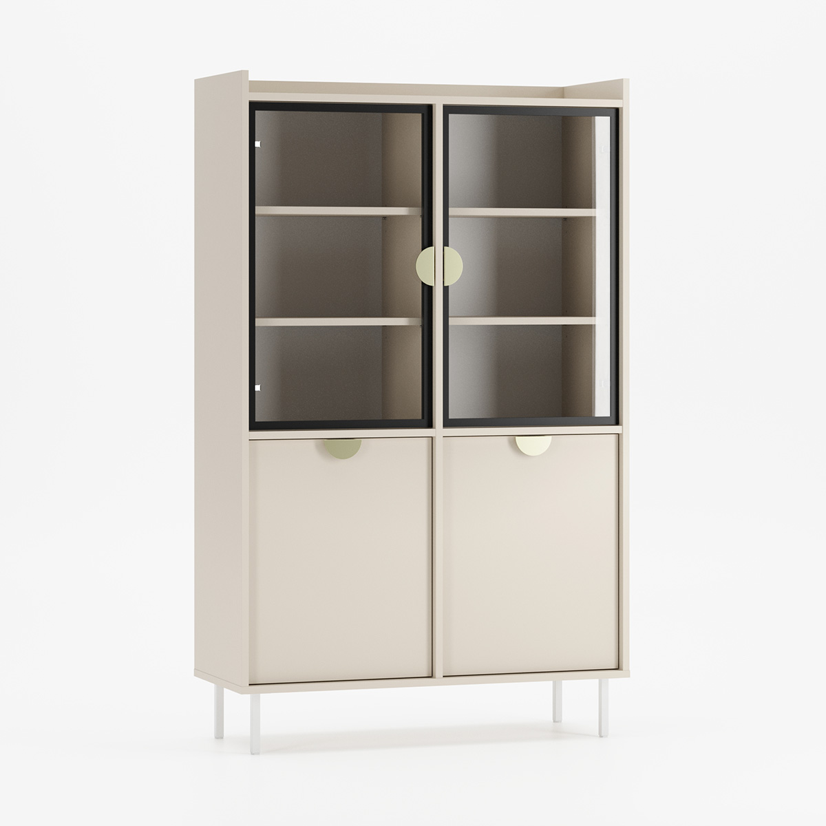 SIGI WSN4 kombinerer estetisk letthet med praktisk oppbevaring i en klassisk inspirert form. Fire romslige hyller bak to glassdører øverst gir perfekt utstillingsplass til bøker, keramikk eller dekorasjoner, mens todelt oppbevaringsrom nederst skjuler diskret tøy, mapper eller utstyr.